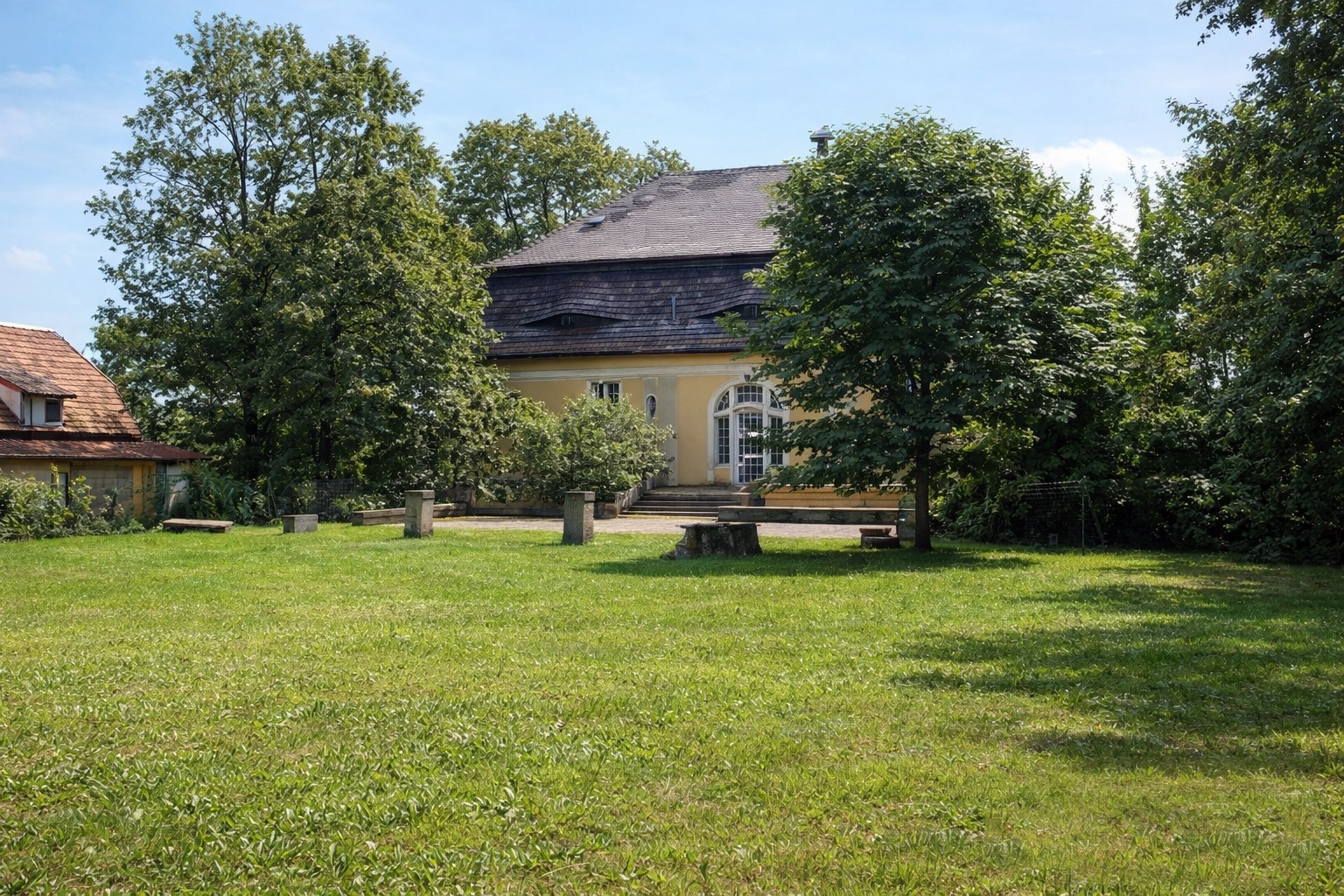 K nehnuteľnosti patrí aj približne 5 000 m² trávnatého pozemku s ovocným sadom, ako aj bývalé stajne (cca 230 m²) s klenutým stropom na žulových stĺpoch a veľkým podkrovím. V posledných rokoch boli vykonané zabezpečovacie práce: strecha uzavretá, trámy obnovené a spevnené, podlahy opravené.