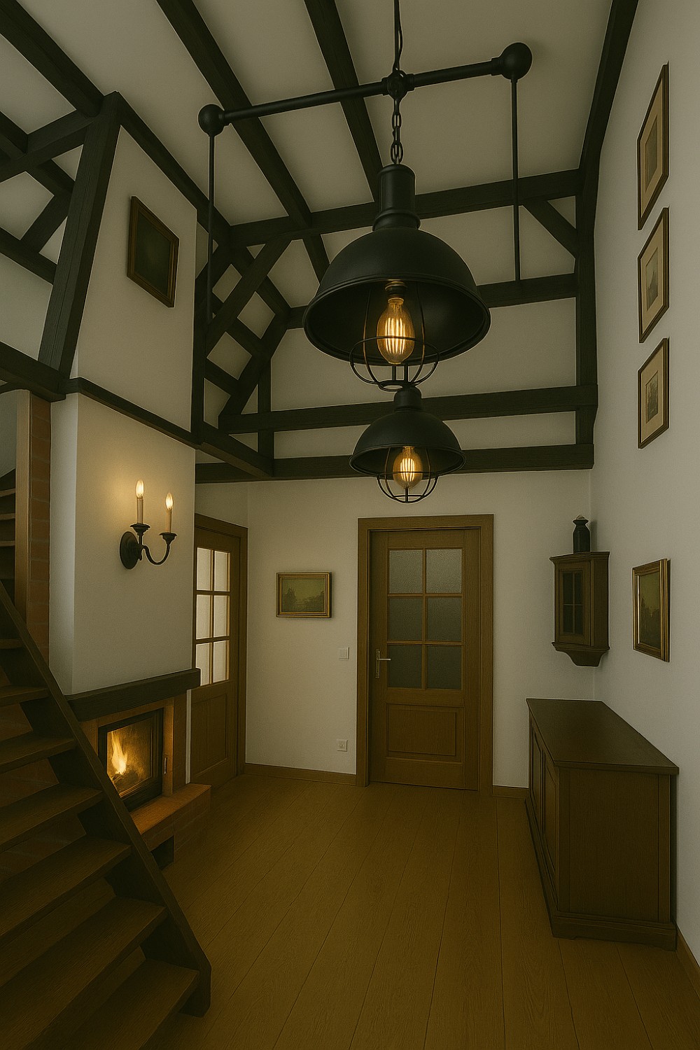 Vstupom hlavnými dverami z terasy sa dostanete do vstupnej haly s krbom a otvoreným výhľadom do druhého poschodia, ktoré je prístupné širokým samostatne stojacim dreveným schodiskom. Vľavo od schodiska sa nachádza útulná obývacia izba s výhľadom do záhrady. Zo vstupnej haly je možné prejsť do kuchyne s jedálenskou časťou a samostatnou miestnosťou, do priestrannej kúpeľne s rohovou vaňou a sprchou, ako aj do dielne s prístupom do pivnice.