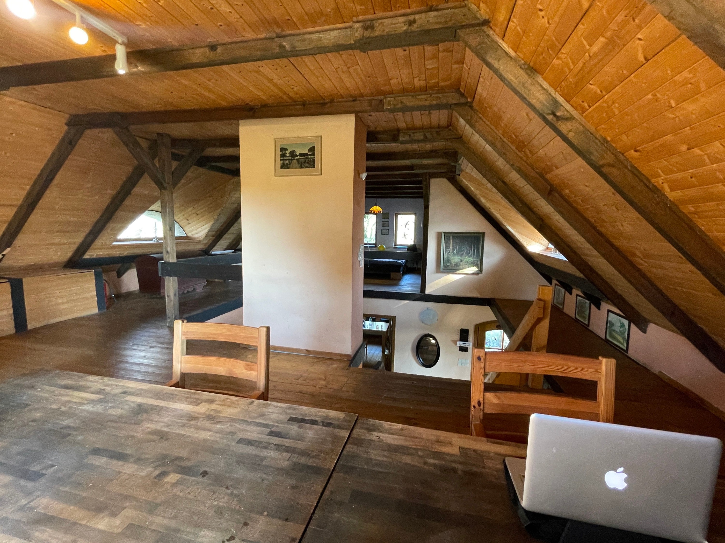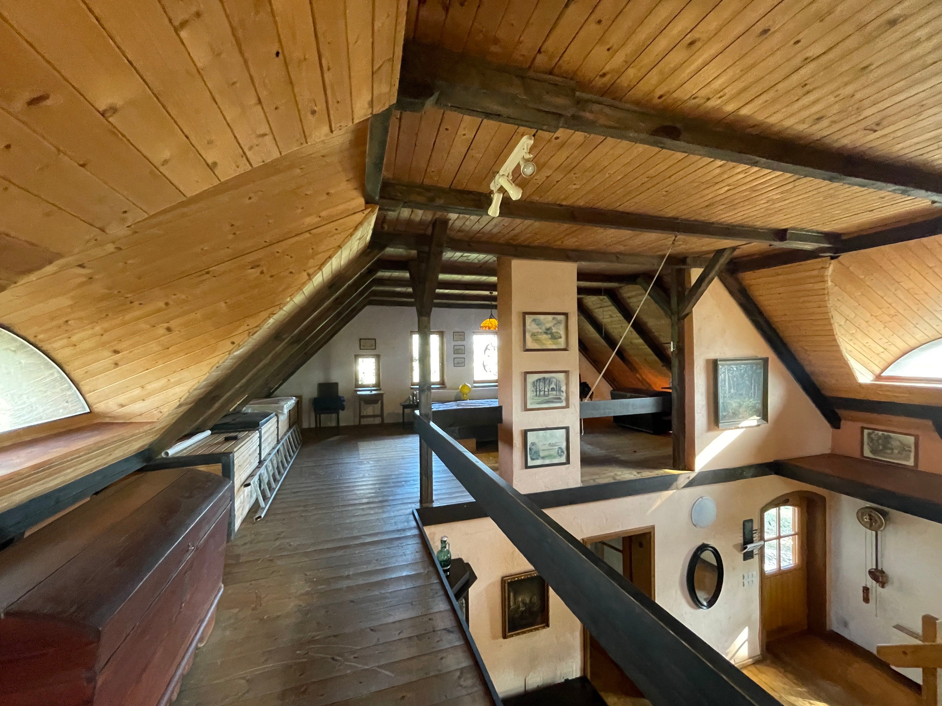 Druhé poschodie tvorí priestranný otvorený podkrovný priestor s dvoma oproti sebe umiestnenými strešnými oknami po stranách galérie a pracovnou a spálňovou časťou pri štítových stranách.