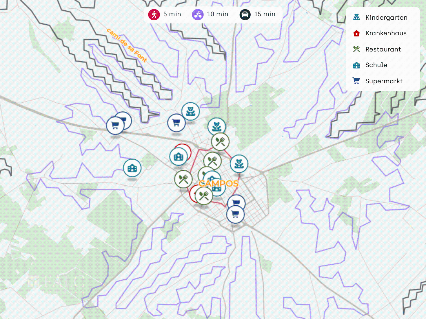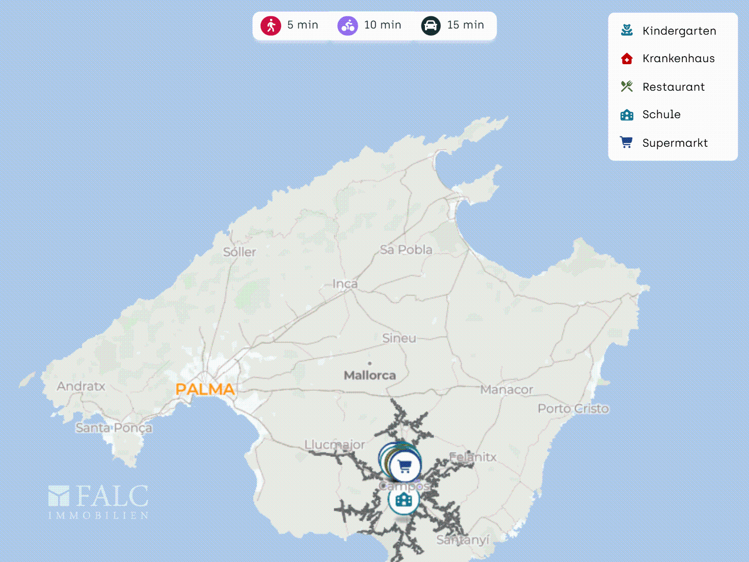Campos je tradičná dedina na juhu Mallorky s kompletnou miestnou infraštruktúrou, krátkymi vzdialenosťami a typickou mallorskou atmosférou. Pláž Es Trenc je vzdialená približne 15 minút jazdy autom a letisko Palma približne 25–30 minút.
