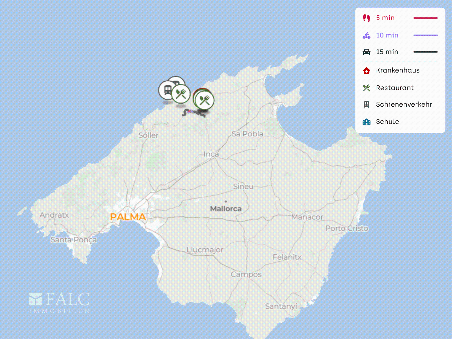 Najbližšia dedina je vzdialená približne 10 minút autom. V okolí Lluc sa nachádza lekáreň, klinika a Escolania de Lluc ako vzdelávacia inštitúcia. Prírodné pláže Cala Tuent a Platja del Torrent de Pareis sú vzdialené len niekoľko kilometrov a patria medzi najpôsobivejšie pobrežné úseky na ostrove. Letisko Palma de Mallorca je dostupné za približne jednu hodinu, v závislosti od trasy.