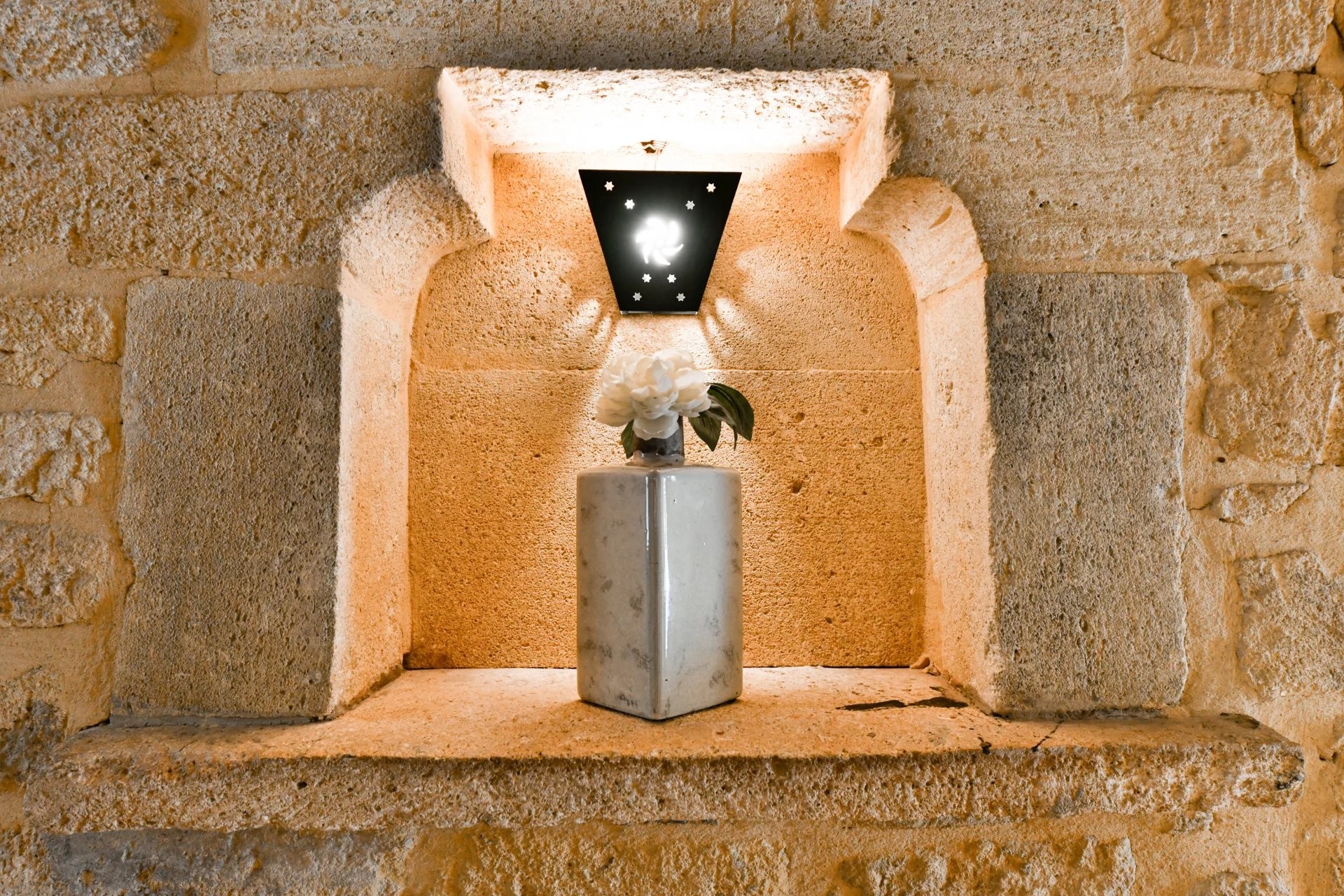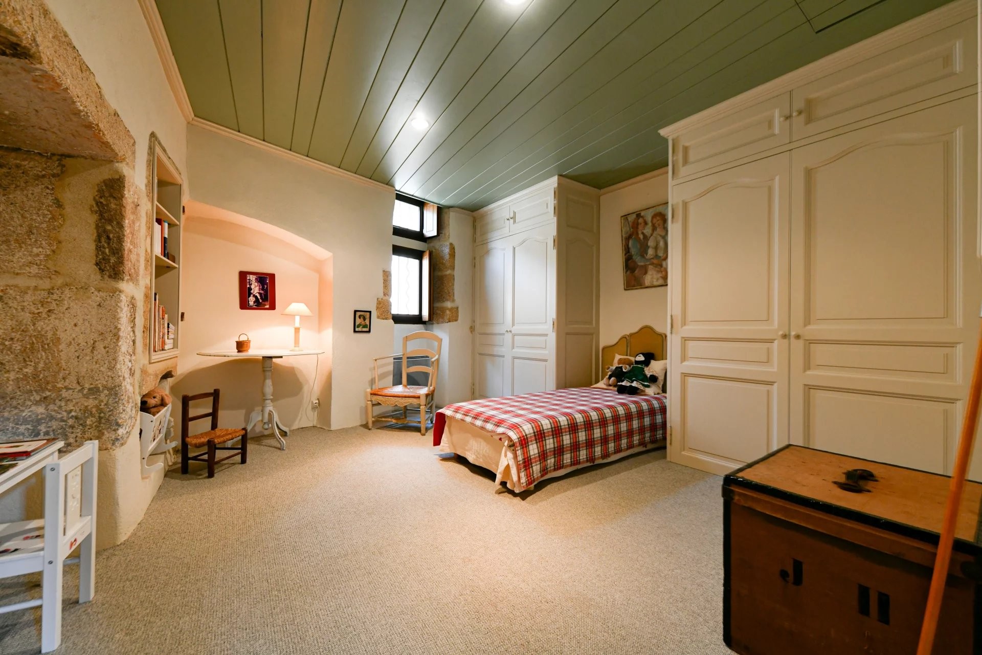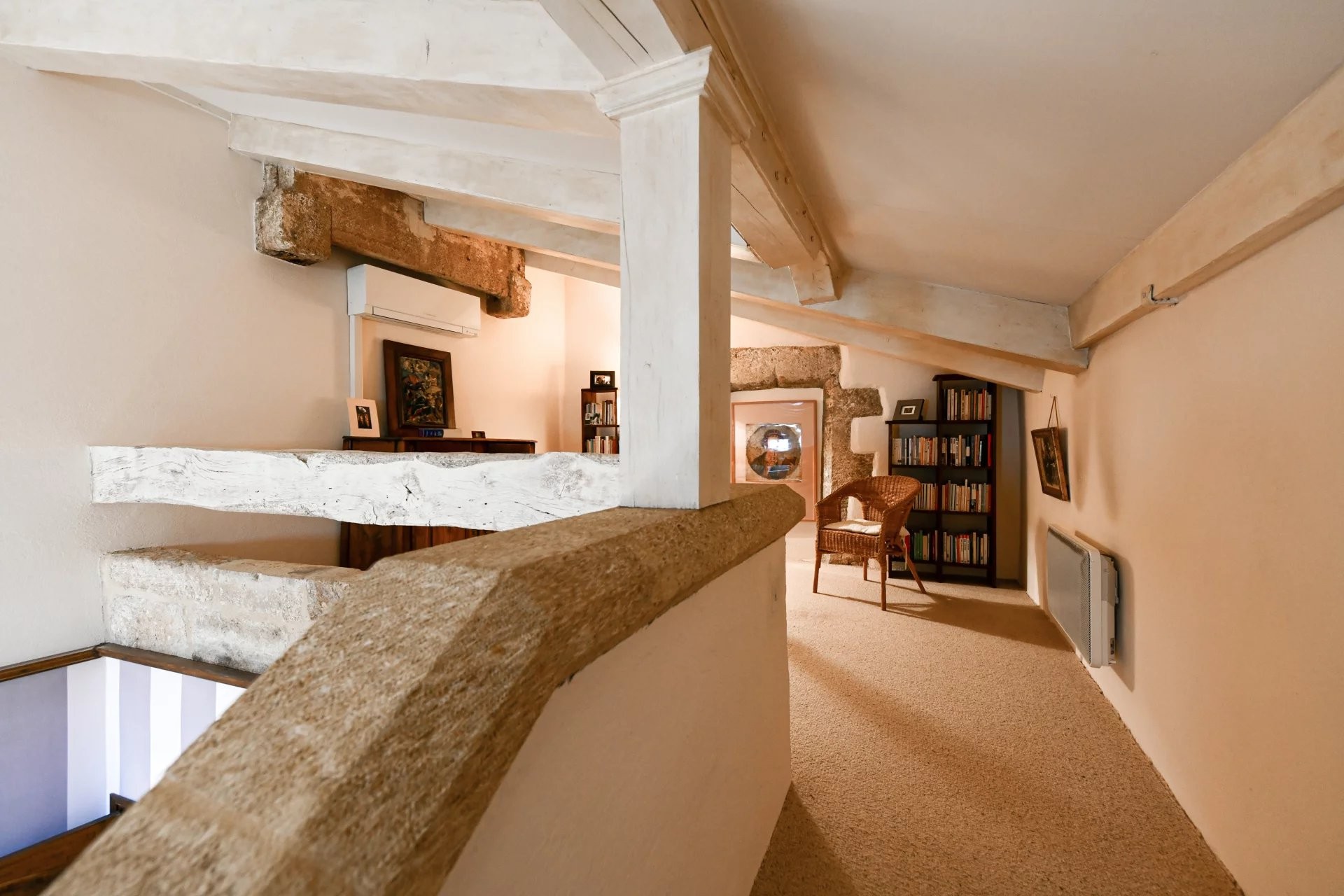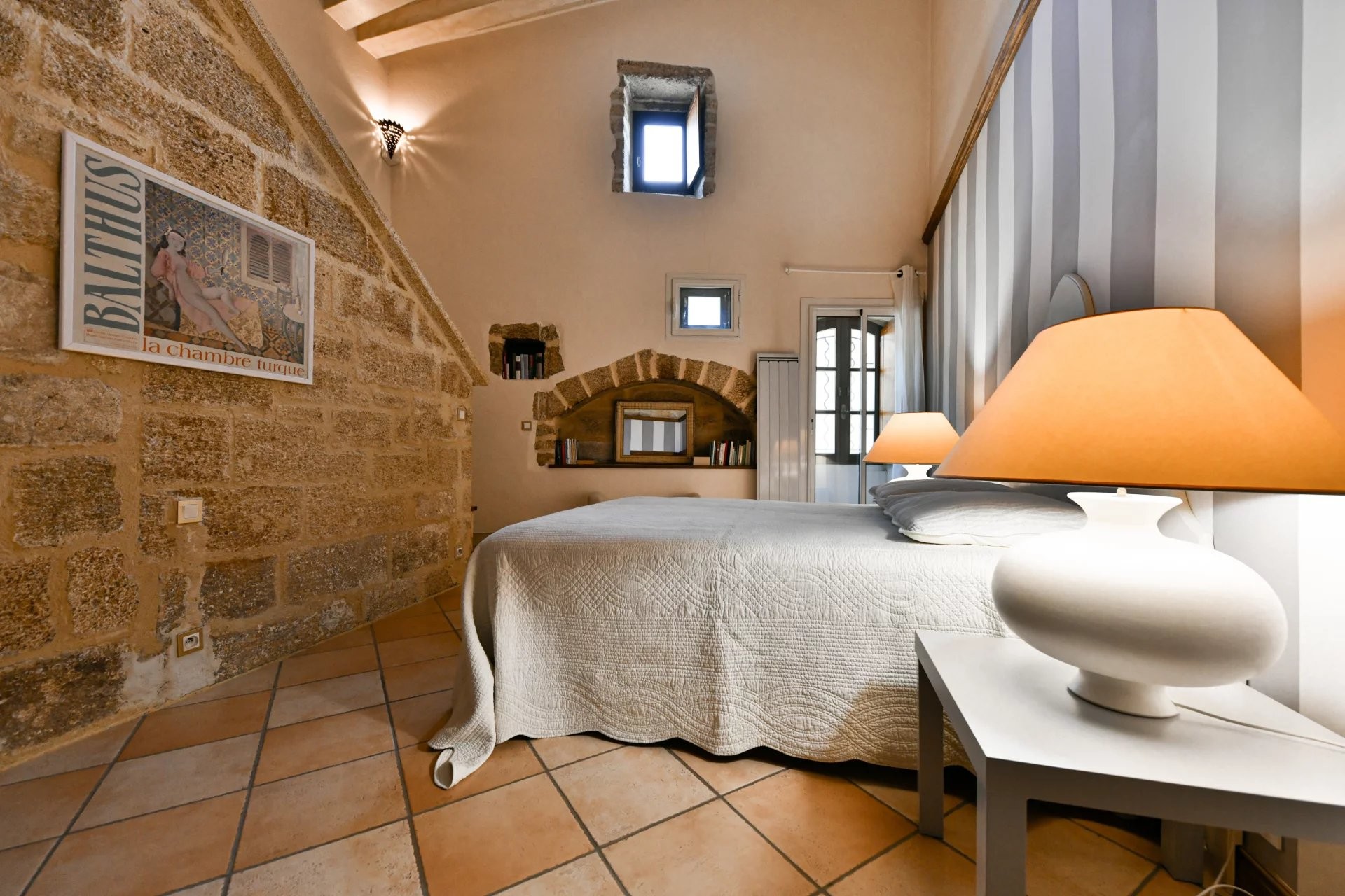 Apartmán pre hostí v dúplexovom štýle, prístupný z terasy, ponúka na prvom poschodí priestrannú suite (42 m²) so spálňou, ktorá vedie na terasu, šatníkom a kúpeľňou (vaňa, sprcha, umývadlo a WC). Na hornom poschodí sa nachádza obývacia izba/jedáleň (19 m²), ktorá vedie na poslednú terasu s výhľadom na strechy starobylého mesta.