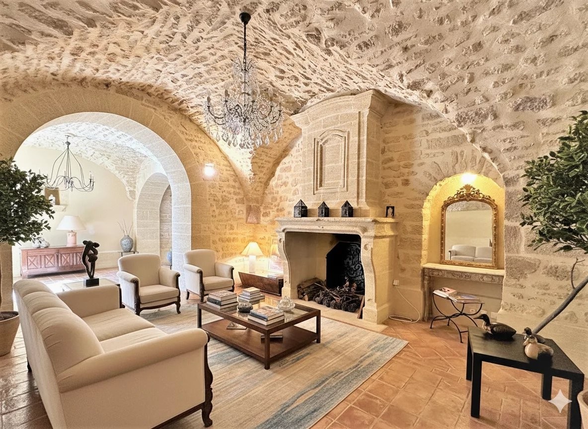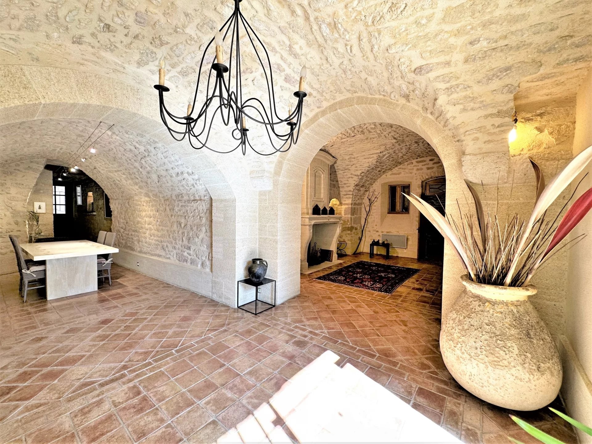Veľký a svetlý vstup otvorí 60 m² veľký príjemný priestor, ktorý zahŕňa obývaciu izbu s dvojitým krížovým klenbom a kamenným krbom, jedáleň a kompletne vybavenú kuchyňu. Pod kuchyňou sa nachádza vínna pivnica.