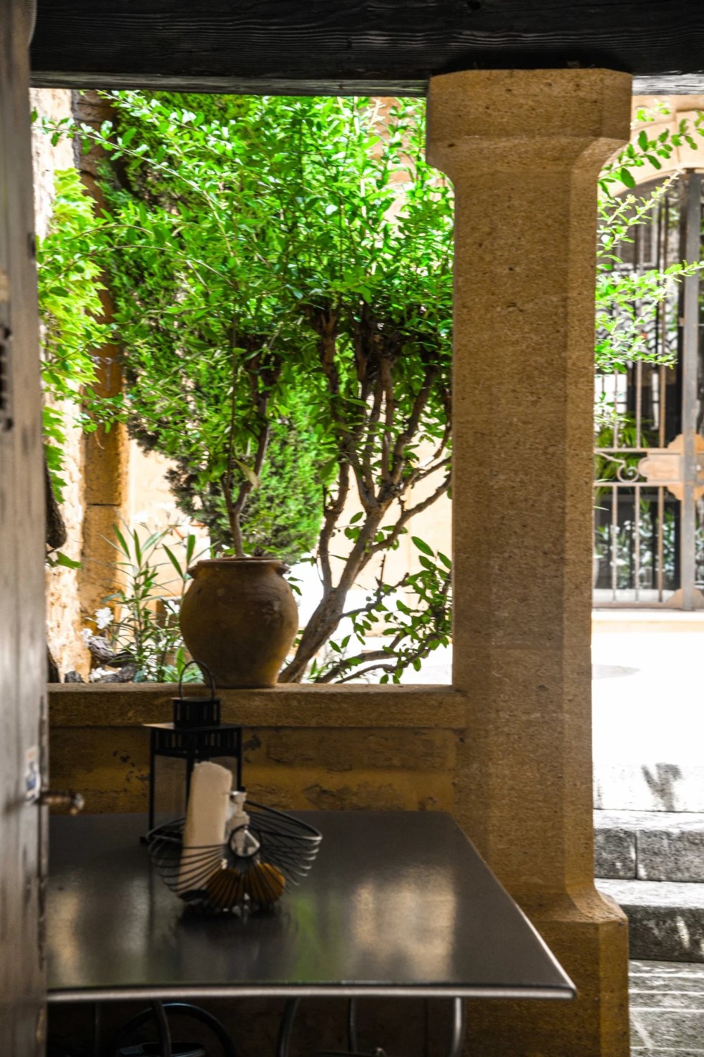 Dvor s rozlohou 53 m² ponúka dve oblasti: Prvá je zakrytá starou strešnou konštrukciou, druhá je otvorená a vedie k sklenenej dverám za umeleckým kovovým plotom.