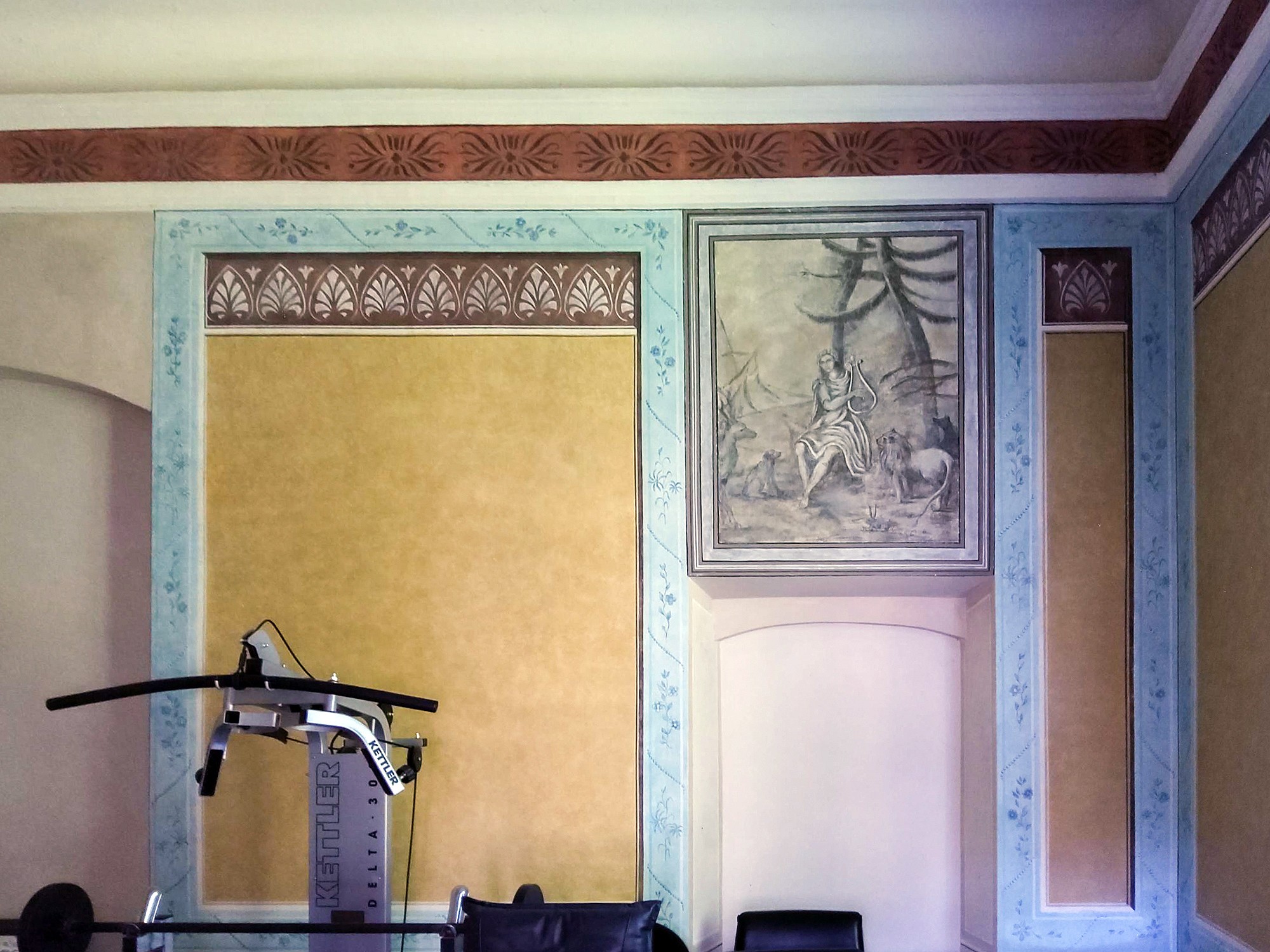Zvláštnu pozornosť si zaslúžia nedávno objavené nástenné maľby s antickými motívmi v južnom krídle. V bočných rizalitoch vedú ďalšie schodiská do obytných častí na poschodí.