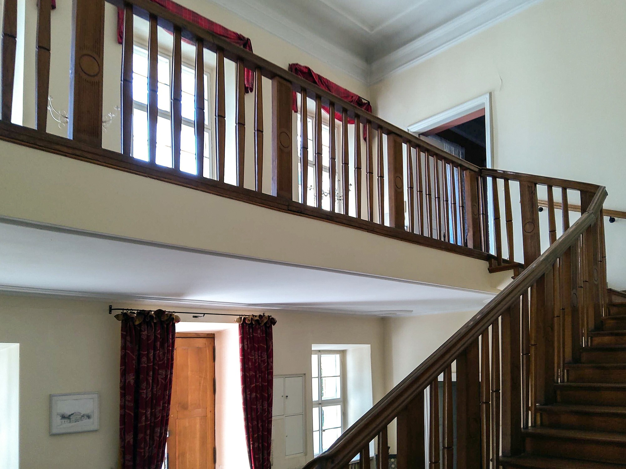 Hlavné priestory sú na poschodí a prístupné cez veľké schodisko: