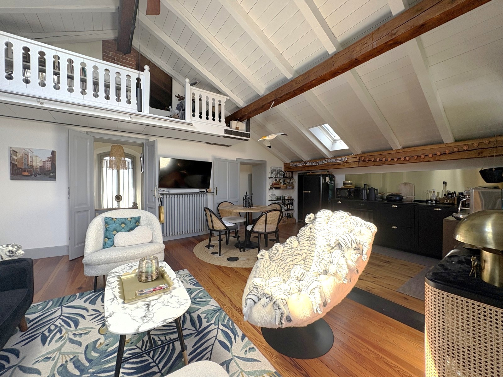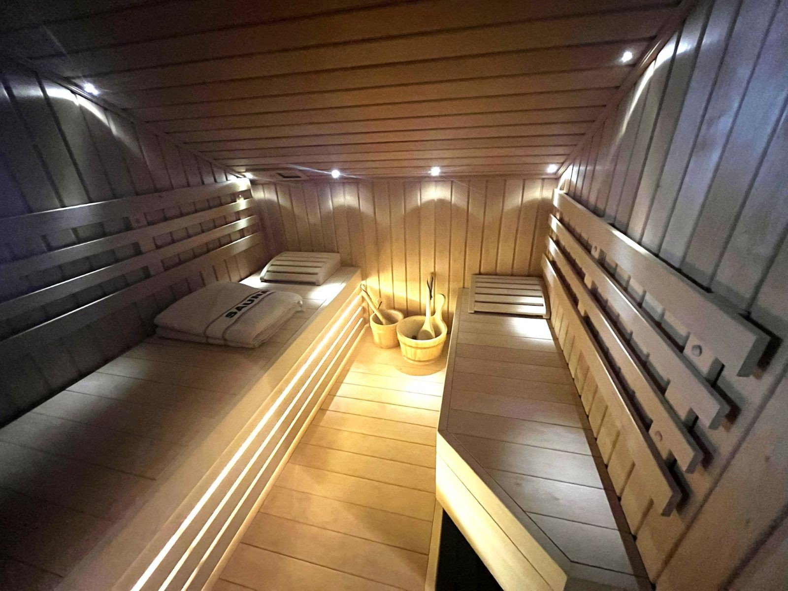 Samostatný byt s odhalenými drevenými trámami, balkónom s výhľadom na jazero, otvorenou obývacou a jedálenskou časťou s kuchyňou, dvomi spálňami, kúpeľňou, súkromnou saunou a galériou v hornej časti.
