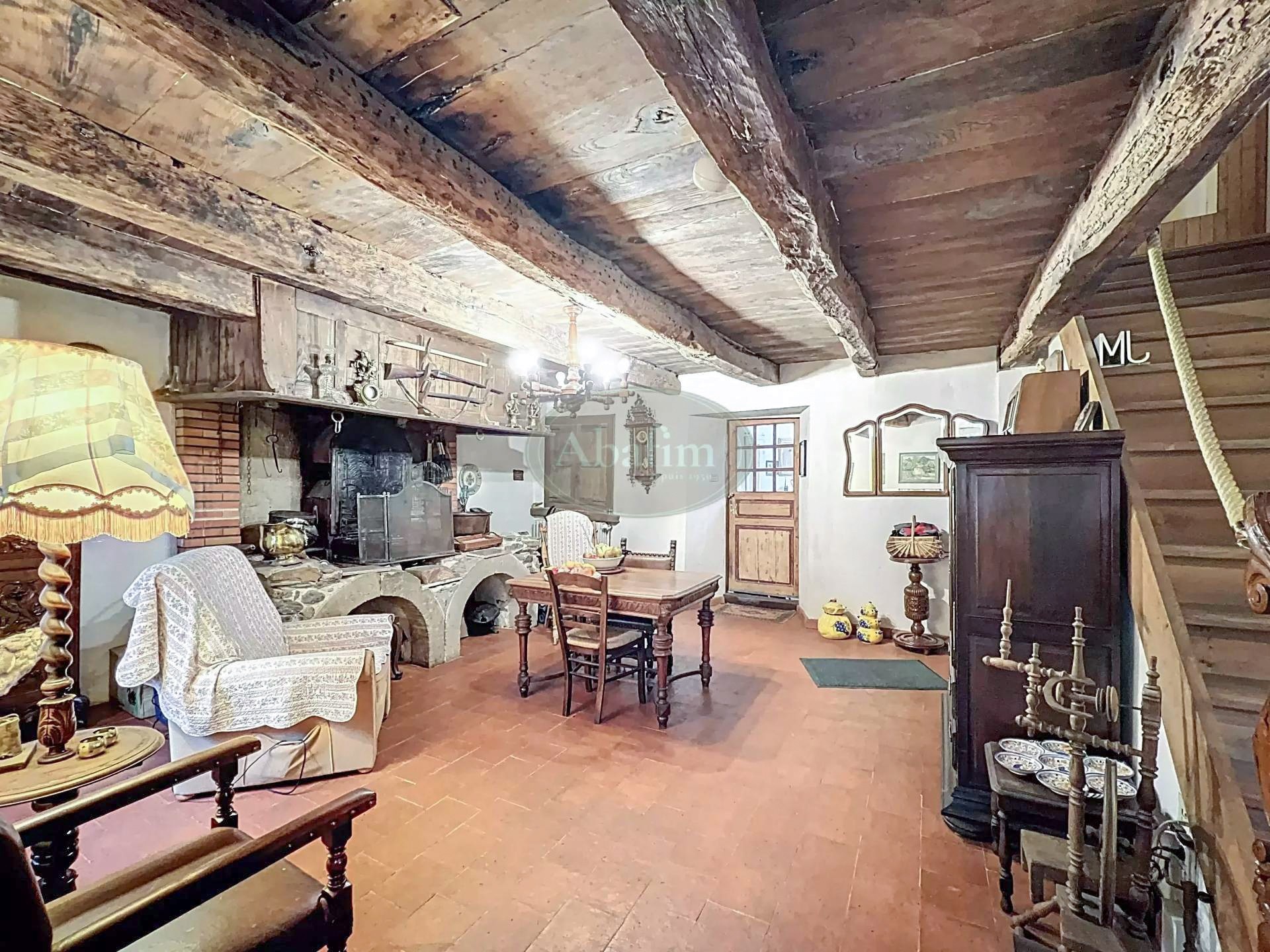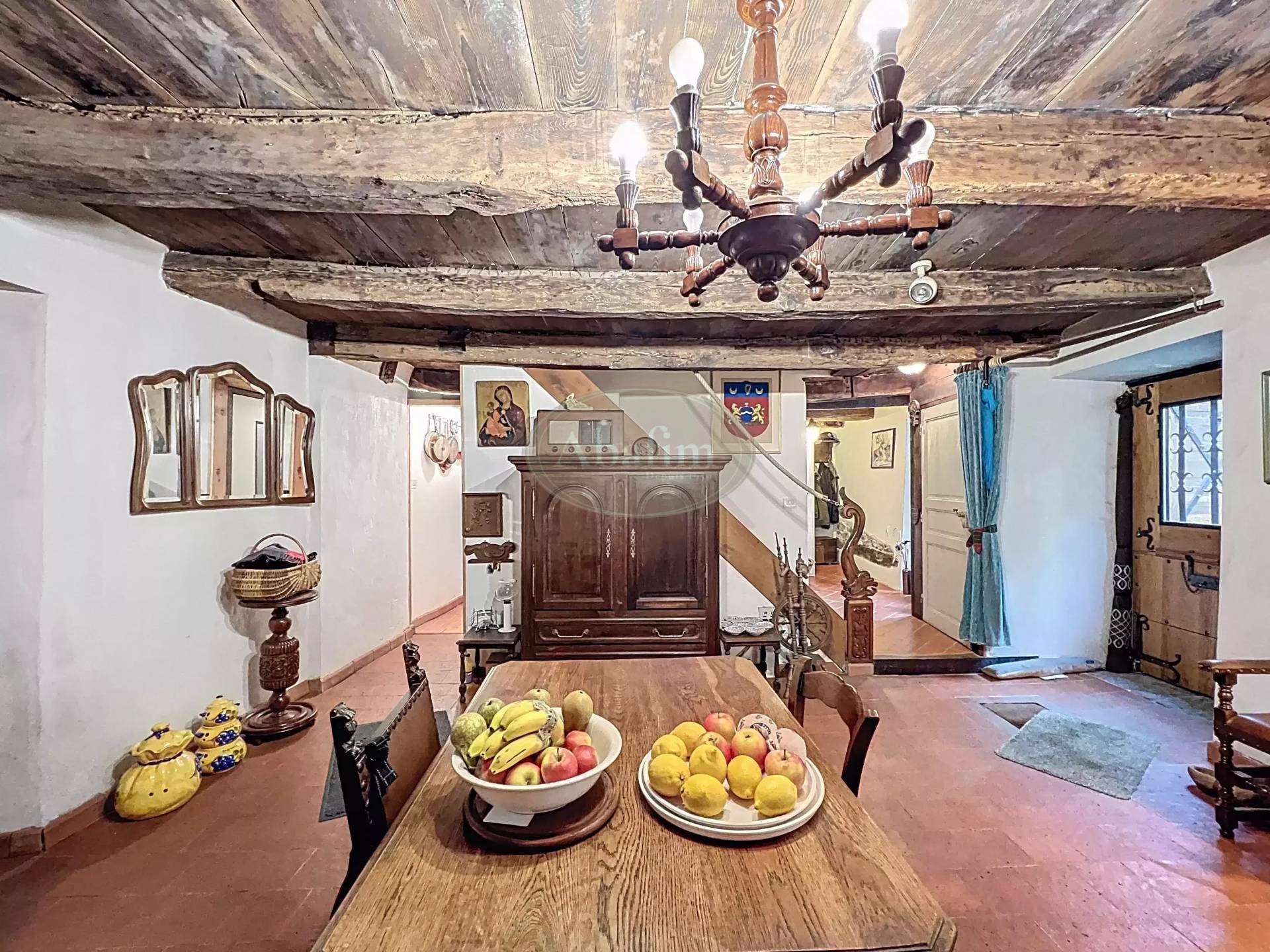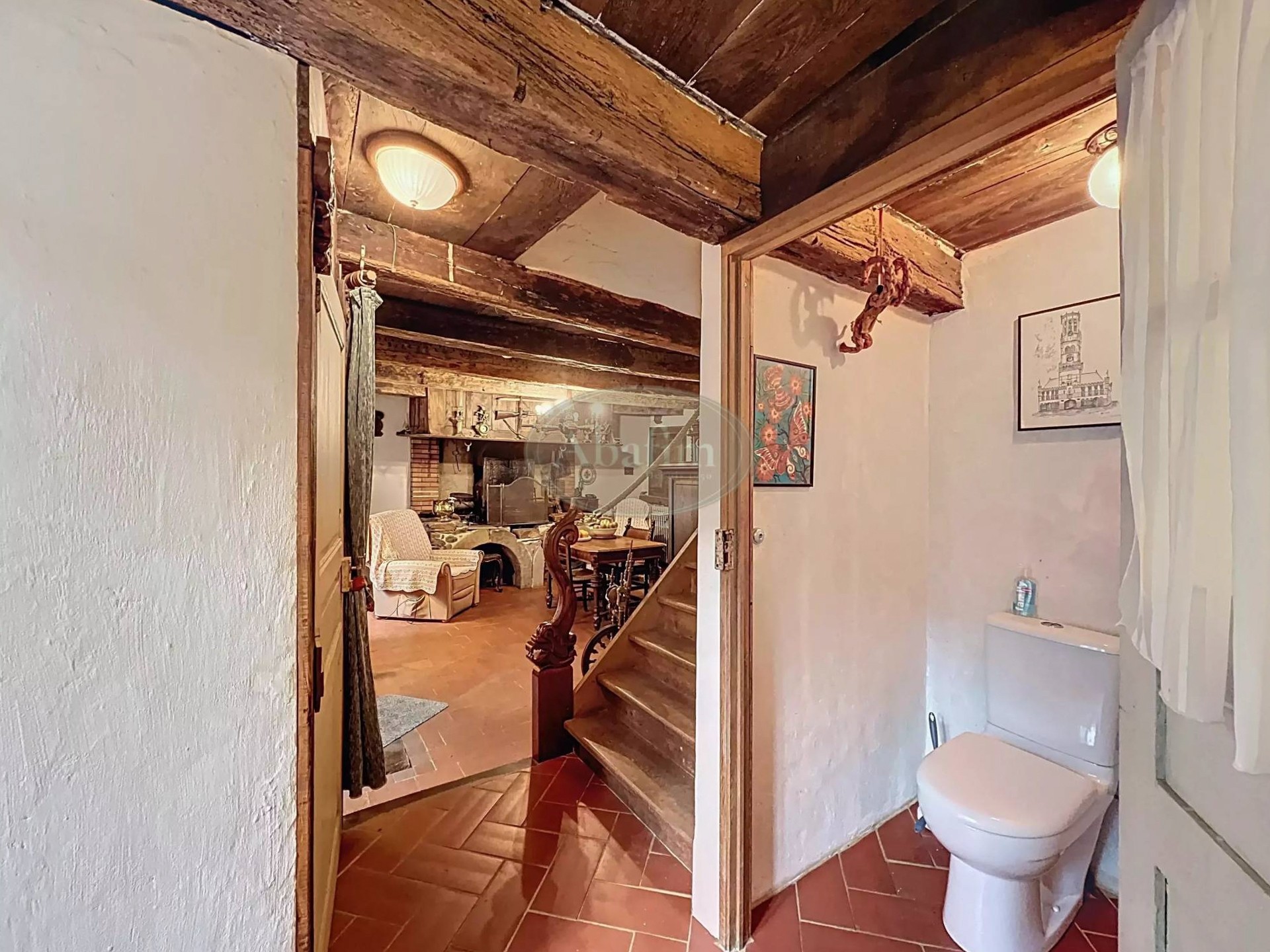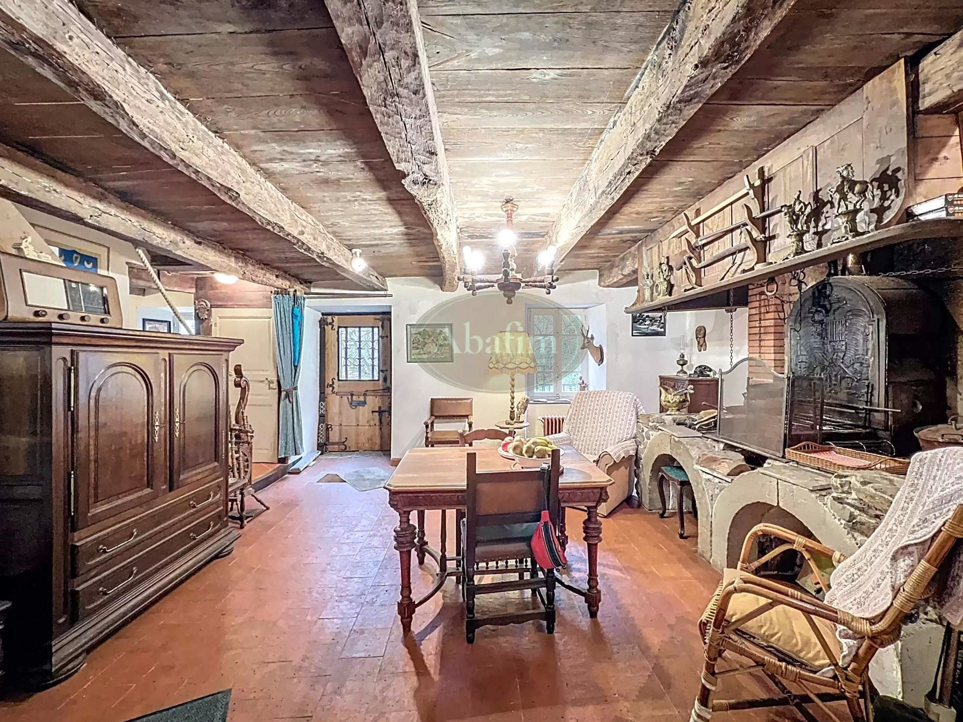 Hlavné podlažie ponúka priestrannú obývaciu izbu s otvoreným krbom a pôvodnou krbovou platňou zdobenou erbom Karel V. Viditeľné trámy, pôvodné terakotové dlaždice a svetlá kuchyňa s jedálňou a priamym vstupom na panoramatickú terasu dodávajú priestoru autentický charakter. Na terase sa nachádza letná kuchyňa s grilom a tradičnou pecou na chlieb.