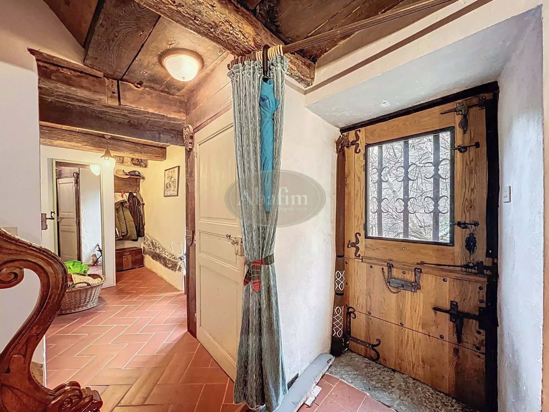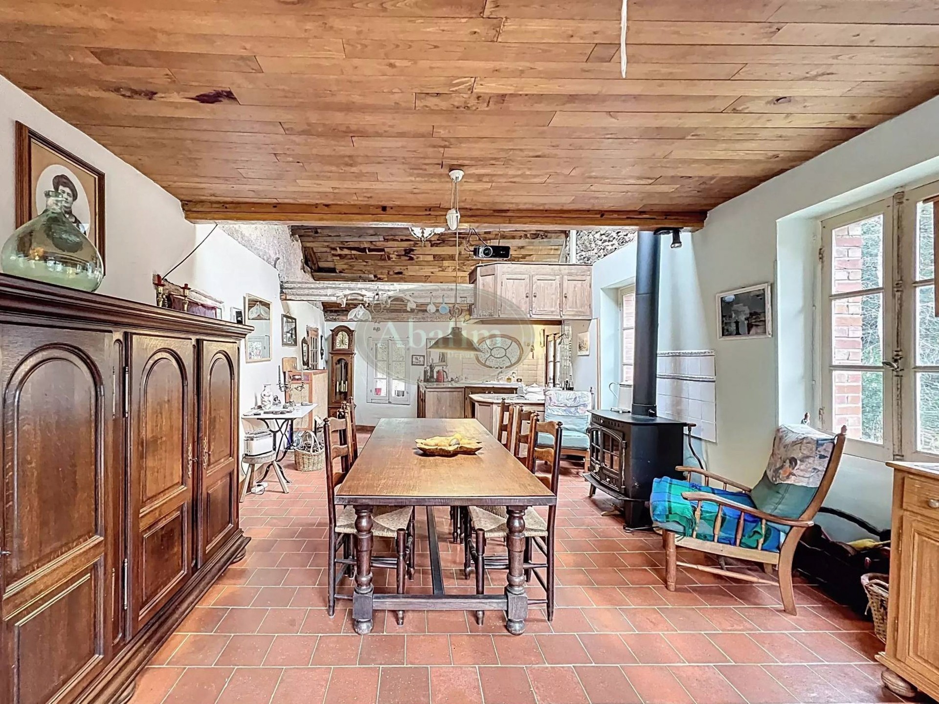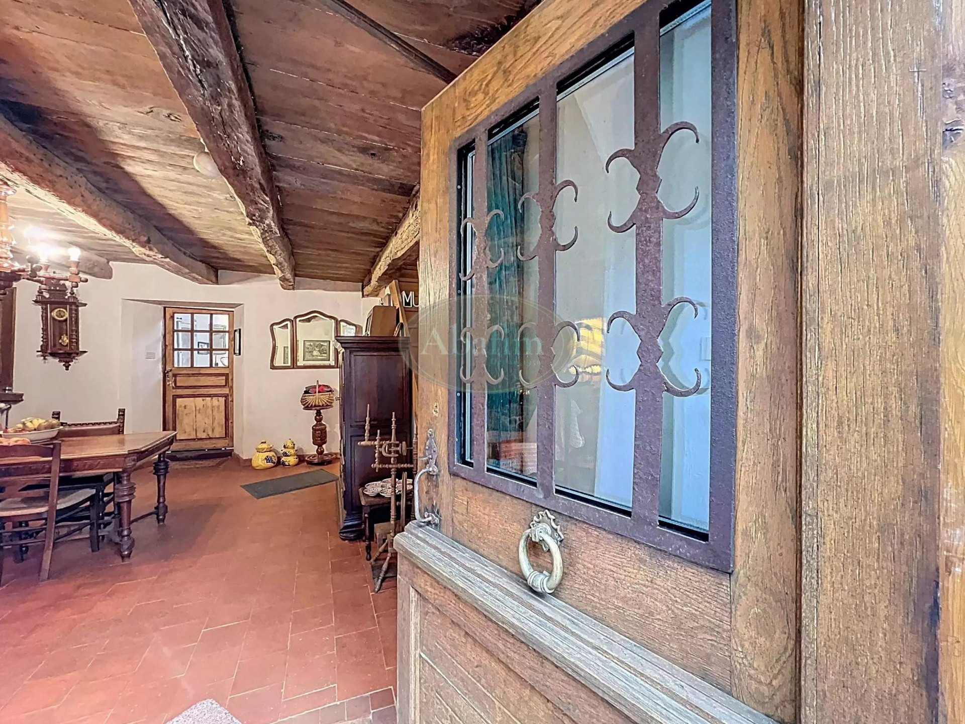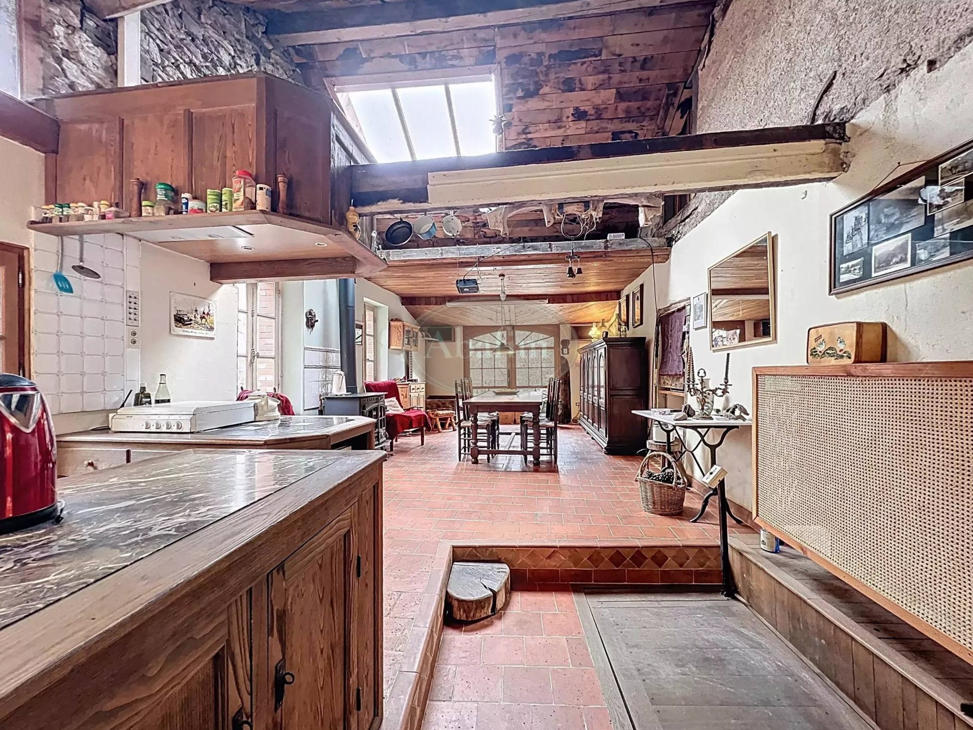 Hlavné podlažie ponúka priestrannú obývaciu izbu s otvoreným krbom a pôvodnou krbovou platňou zdobenou erbom Karel V. Viditeľné trámy, pôvodné terakotové dlaždice a svetlá kuchyňa s jedálňou a priamym vstupom na panoramatickú terasu dodávajú priestoru autentický charakter. Na terase sa nachádza letná kuchyňa s grilom a tradičnou pecou na chlieb.