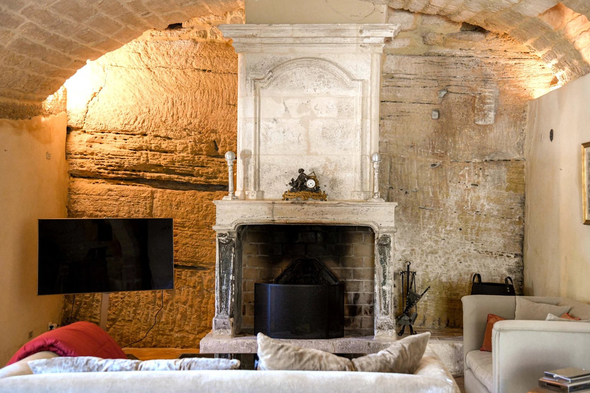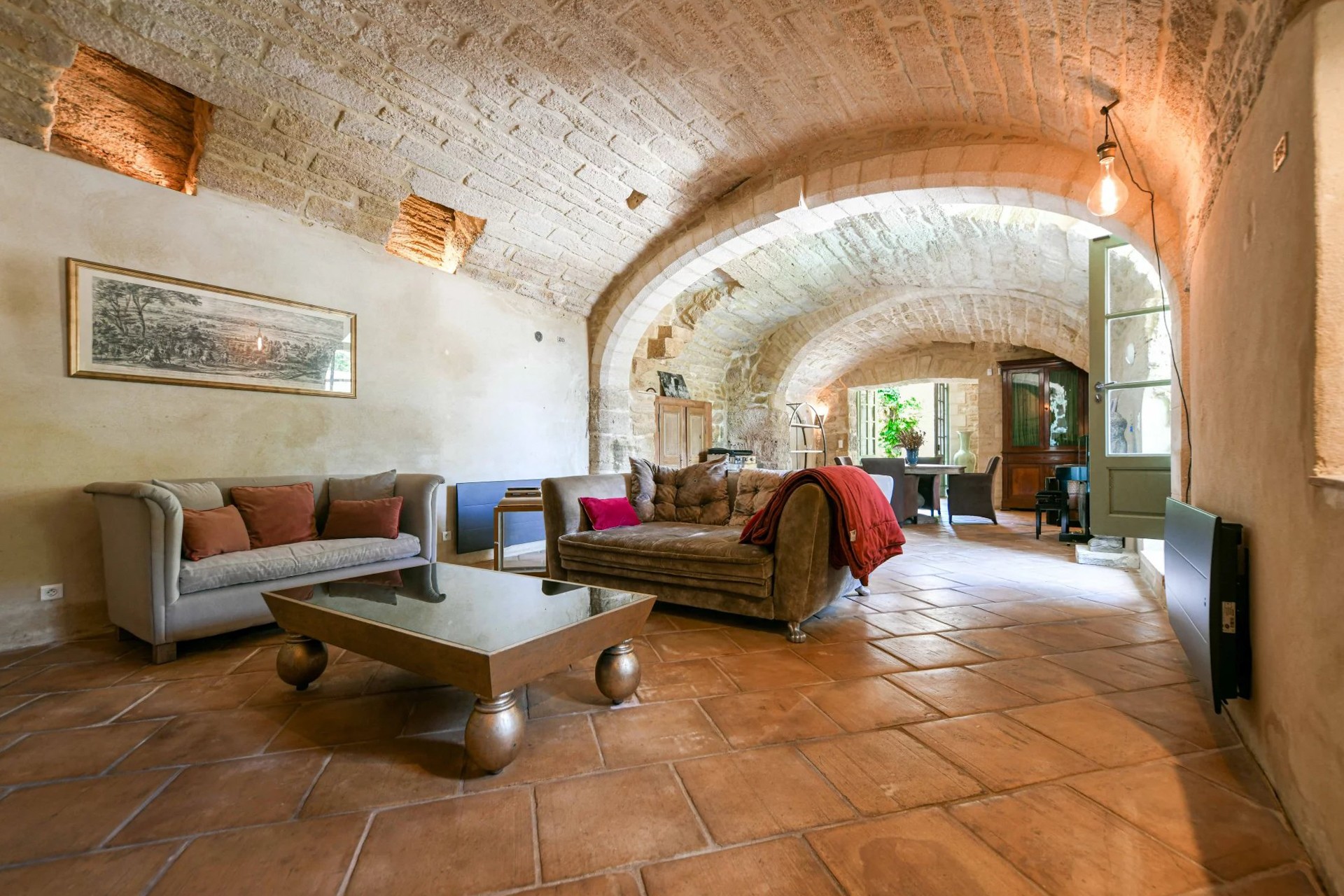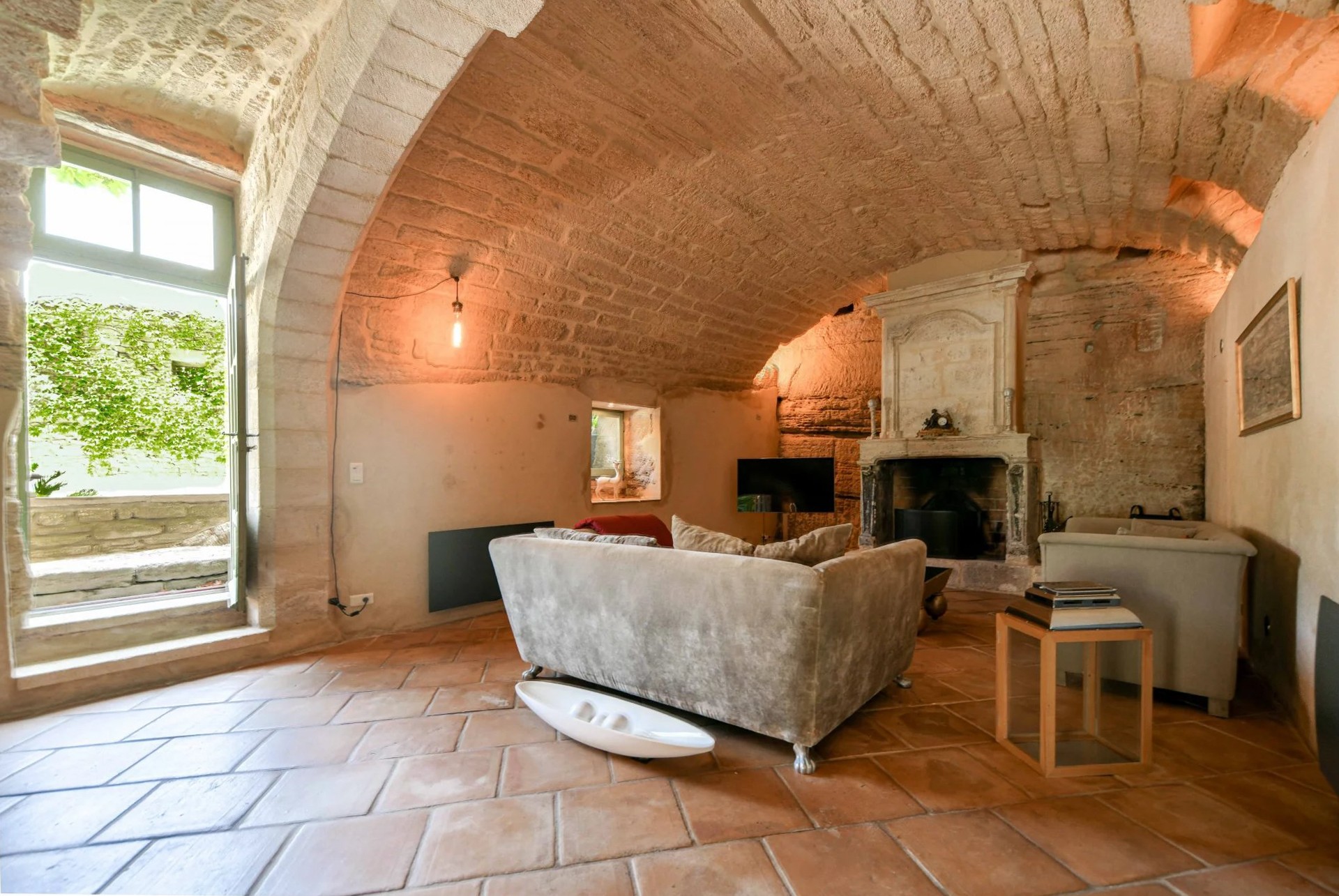 Malý vnútorný dvor vedie k hlavnému vchodu a okamžite podčiarkuje jedinečný charakter nehnuteľnosti. V vstupnej hale upúta pozornosť pôsobivá klenutá stropná konštrukcia priestrannej obývacej izby, kde dominuje výrazný kamenný krb vystupujúci z kamennej steny. Obývacia izba s rozlohou 59 m², ktorá bola kedysi stajňou, je presvetlená veľkými oknami smerujúcimi na terasu a ponúka autentickú a zároveň elegantnú atmosféru. Z vchodu sa dostanete aj do druhej útulnej obývacej izby (19 m²) s monumentálnym krbom. Táto miestnosť je prepojená s kuchyňou a kamenným schodiskom – terasa je prístupná cez presklené dvere.
