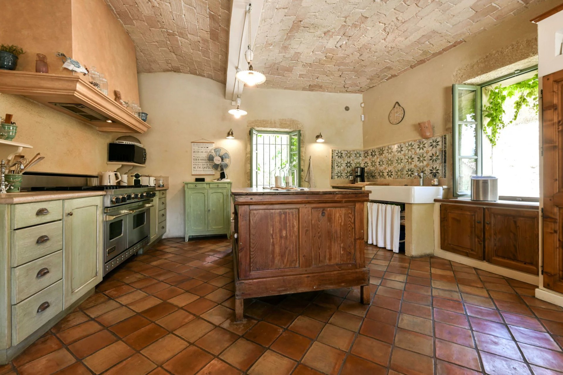 Dvojitá, plne vybavená kuchyňa má plynový sporák s piatimi horákmi, dvojitú rúru, umývačku riadu a príťažlivý drevený ostrovček. Kuchyňa je presvetlená z troch strán a zdobia ju krásne stropy so vzorom rybej kosti. Kamenný oblúk oddeľuje neformálnu jedáleň (celkovo 35 m²), ktorá má široké terasové dvere priamo na terasu. K dispozícii je aj hosťovské WC.