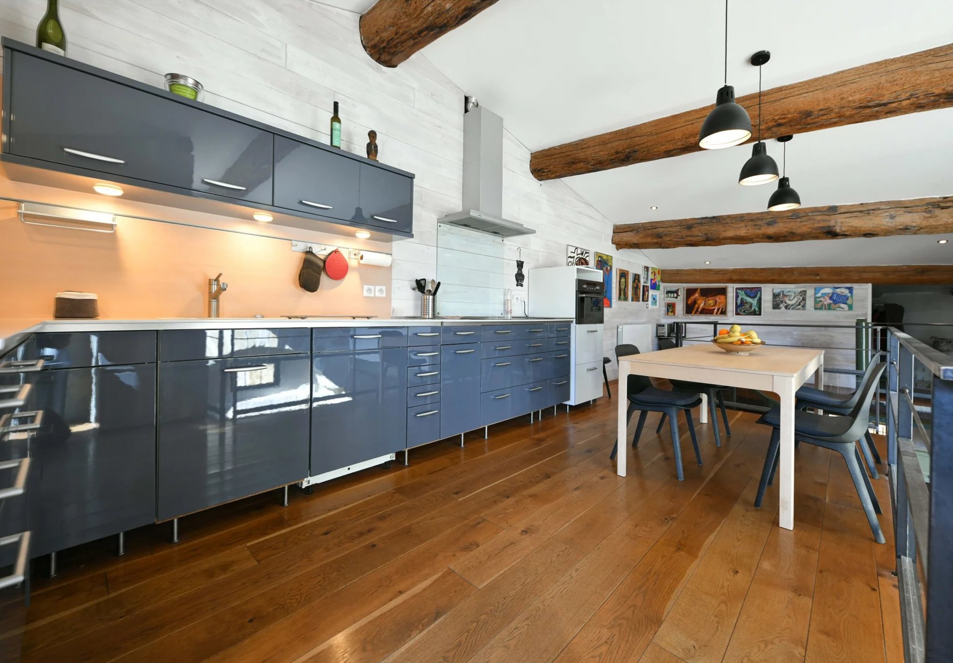 Na poschodí je otvorená kuchyňa s výhľadom do obývacej časti a spálňa so šatníkom. Súkromná terasa vedie do tretej, samostatnej spálne.