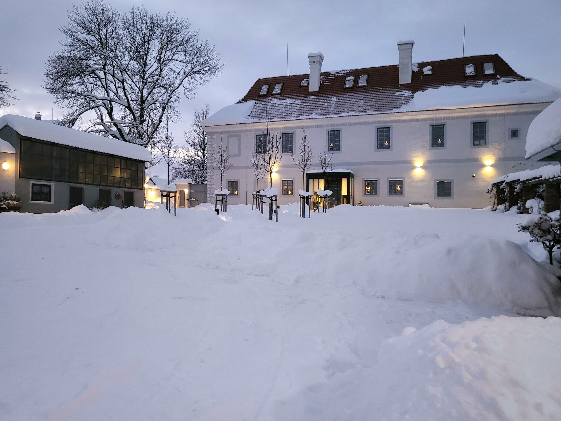 Pôvodná kočiareň na hrade bola prestavaná na garáž s dvoma automatickými sekcionálnymi bránami, v ktorej sa dajú pohodlne zaparkovať štyri autá, a oproti nej sa nachádza hradná stodola s dvoma samostatnými butikovými apartmánmi pre hostí s vlastnými kúpeľňami a toaletami. Pre návštevníkov vonkajších zariadení je k dispozícii aj samostatné WC so sprchou a umývadlom.