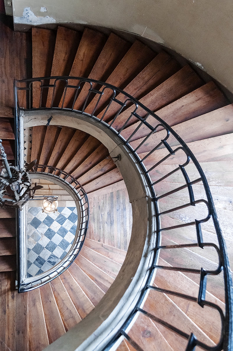 Das Foto zeigt das Haupttreppenhaus im Schloss. Es zeigt sehr gut die Geschichte der französischen Architektur vom Mittelalter bis zum Klassizismus.