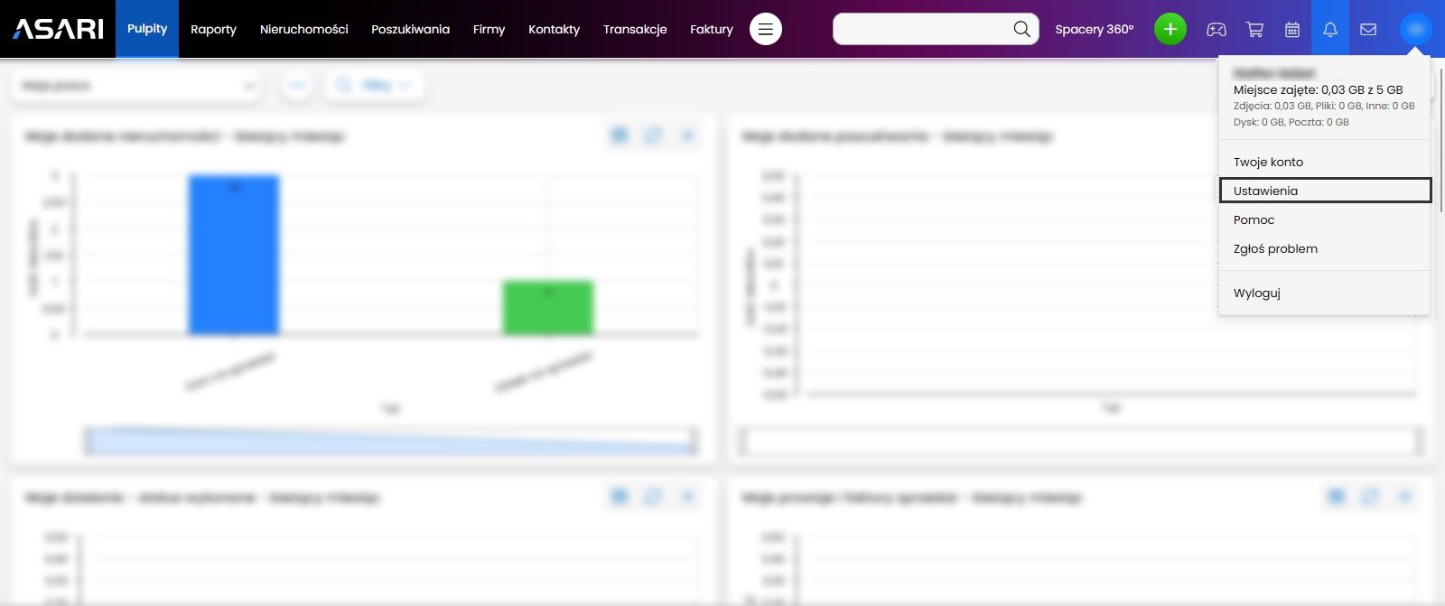 1. Zaloguj się do programu i przejdź do ustawień w prawym górnym rogu menu. asari ustawienia, realportico.pl
