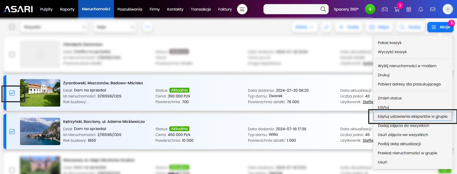 1. Ustawienia do transmisji FTP nieruchomości zostały zakończone. Teraz przejdź w programie do sekcji "Nieruchomości" w głównym menu na górze. Wybierz odpowiednie nieruchomości, które mają pojawić się na realportico.pl, a następnie kliknij po prawej stronie w "Akcje" na "Edytuj ustawienia eksportów w grupie". Eksport nieruchomości do realportico.pl, ASARI