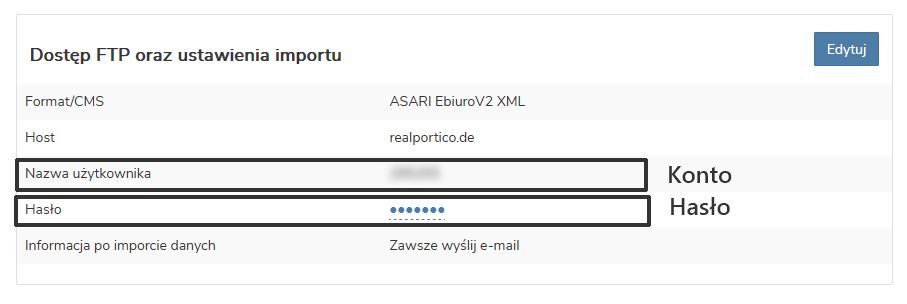 2. Wprowadź teraz dane dostępowe do serwera FTP REALPORTICO. Znajdziesz je w swoim indywidualnym panelu na portalu. Po zalogowaniu kliknij na zakładkę "Konto". Tam znajdziesz dane do "Konto" oraz "Hasło". W polu "Konto" wprowadź wyświetloną wartość "Nazwa użytkownika", a w polu "Hasło" wprowadź odpowiadające hasło. Jeśli masz wątpliwości, zastosuj ustawienia pokazane tutaj i kliknij "Zapisz".