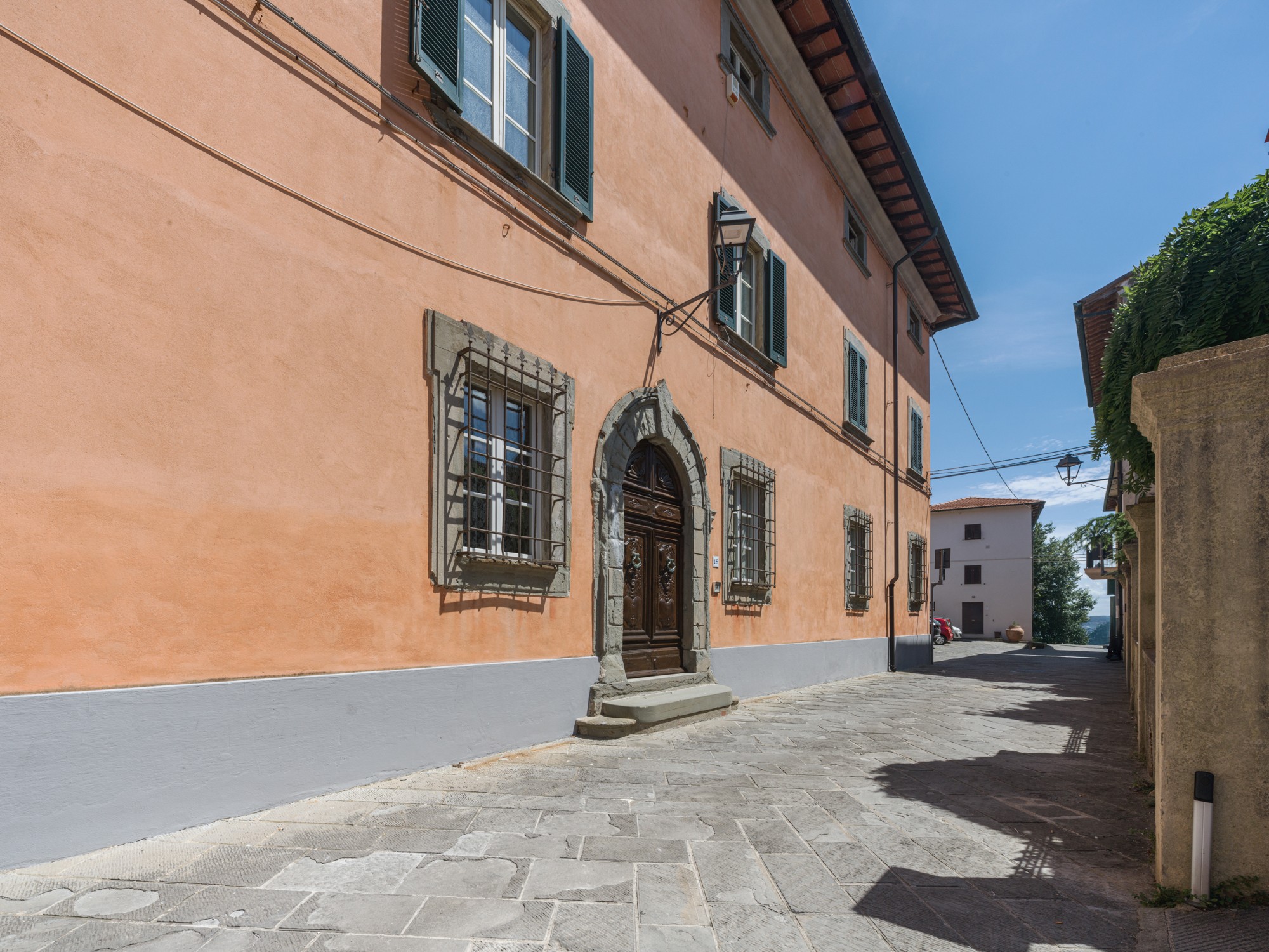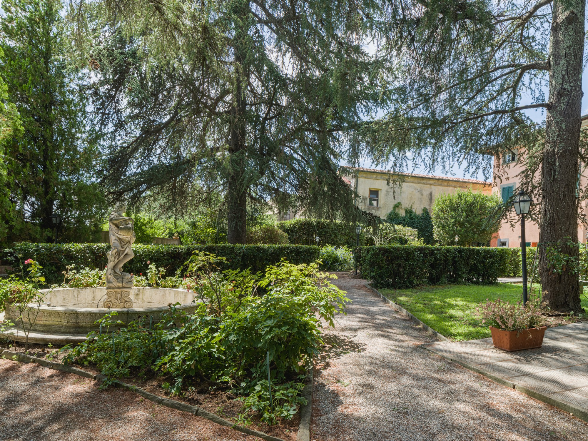 Den parkliknande tomten med äldre träd erbjuder en vidsträckt utsikt över det toskanska landskapet. En formell italiensk trädgård angränsar till byggnaden. Tillstånd för byggnation av pool (15 × 8 m, djup 1,6 m) finns. Ytterligare ytor finns tillgängliga för trädgårdsbruk eller rekreation.