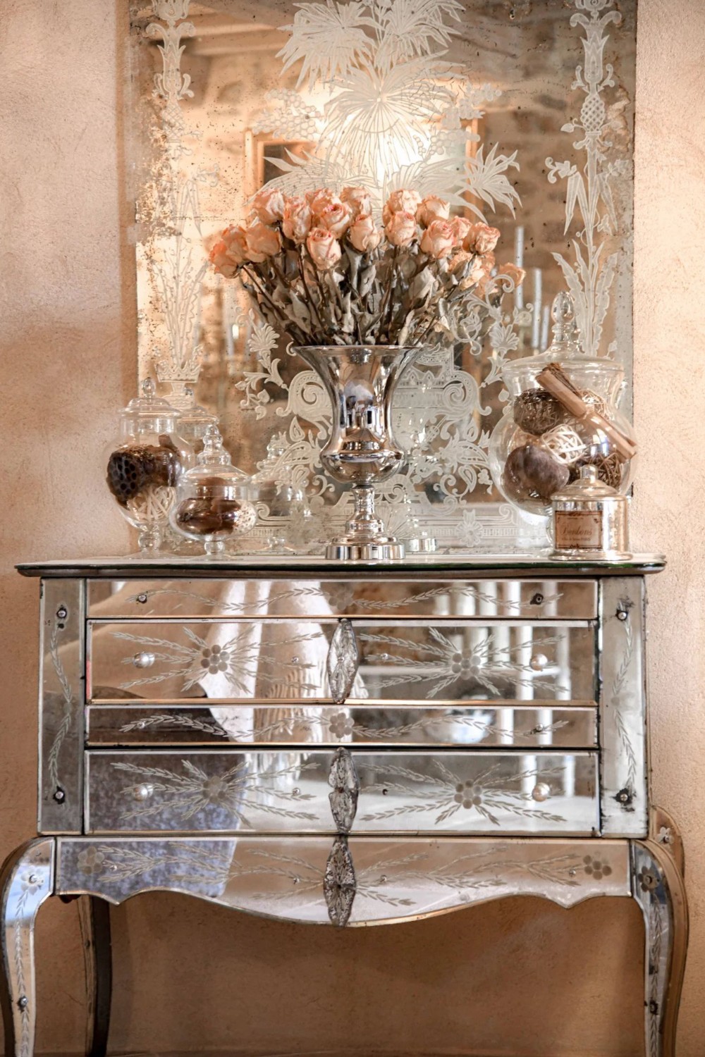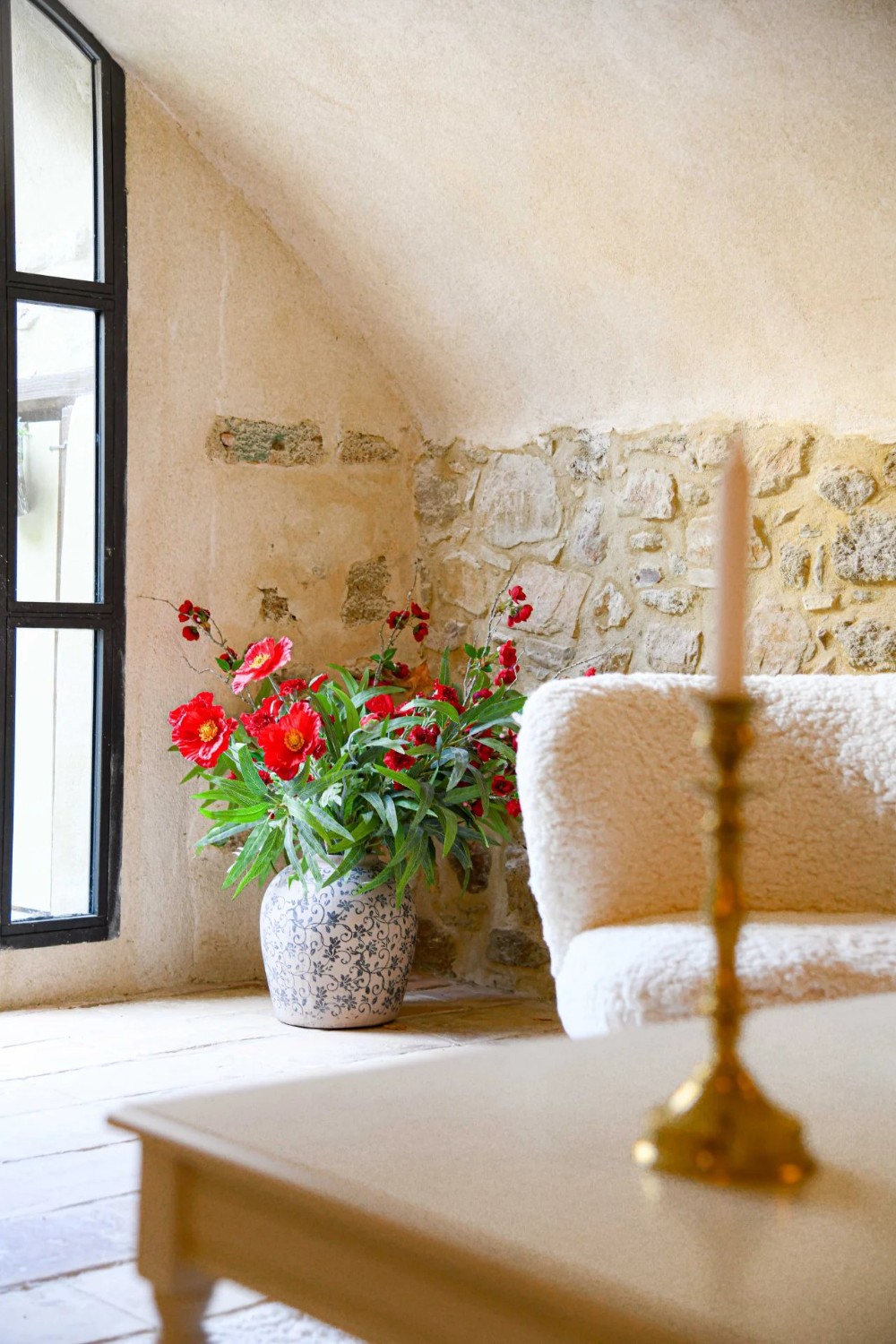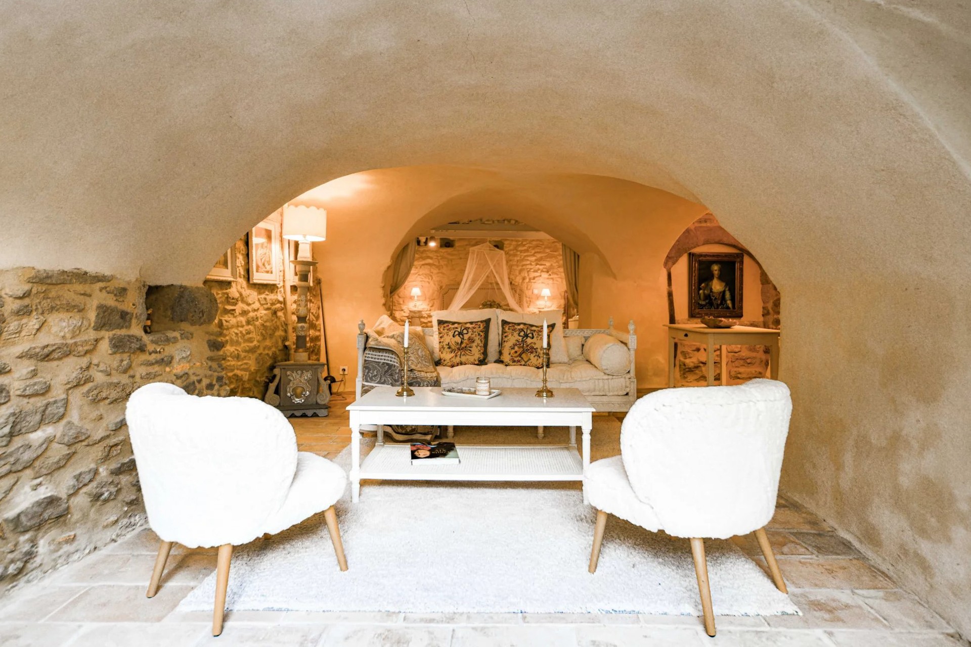 På första våningen finns ett fullt utrustat kök med matplats som öppnar upp mot en svalgång, samt en matsal och ett vardagsrum med öppen spis. Ett litet kontor kompletterar planlösningen.