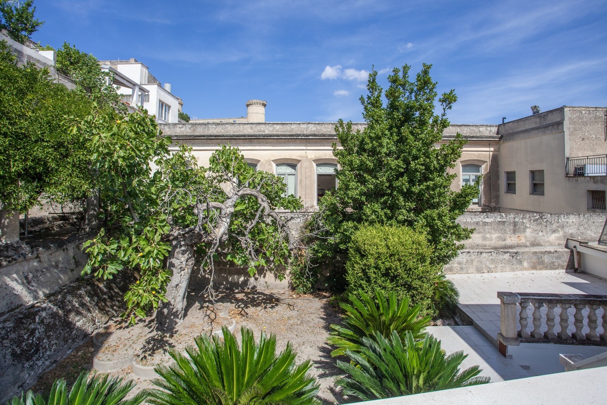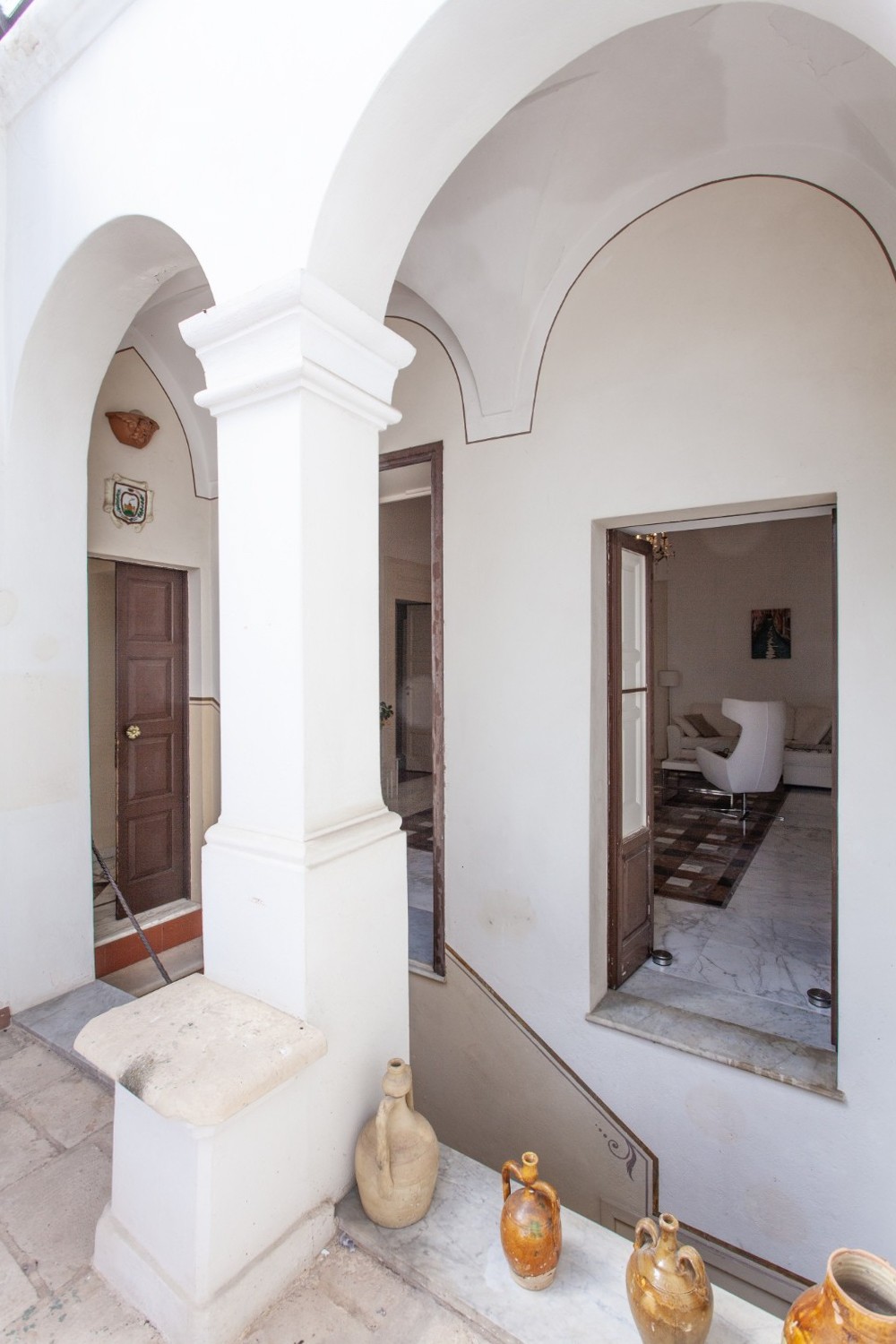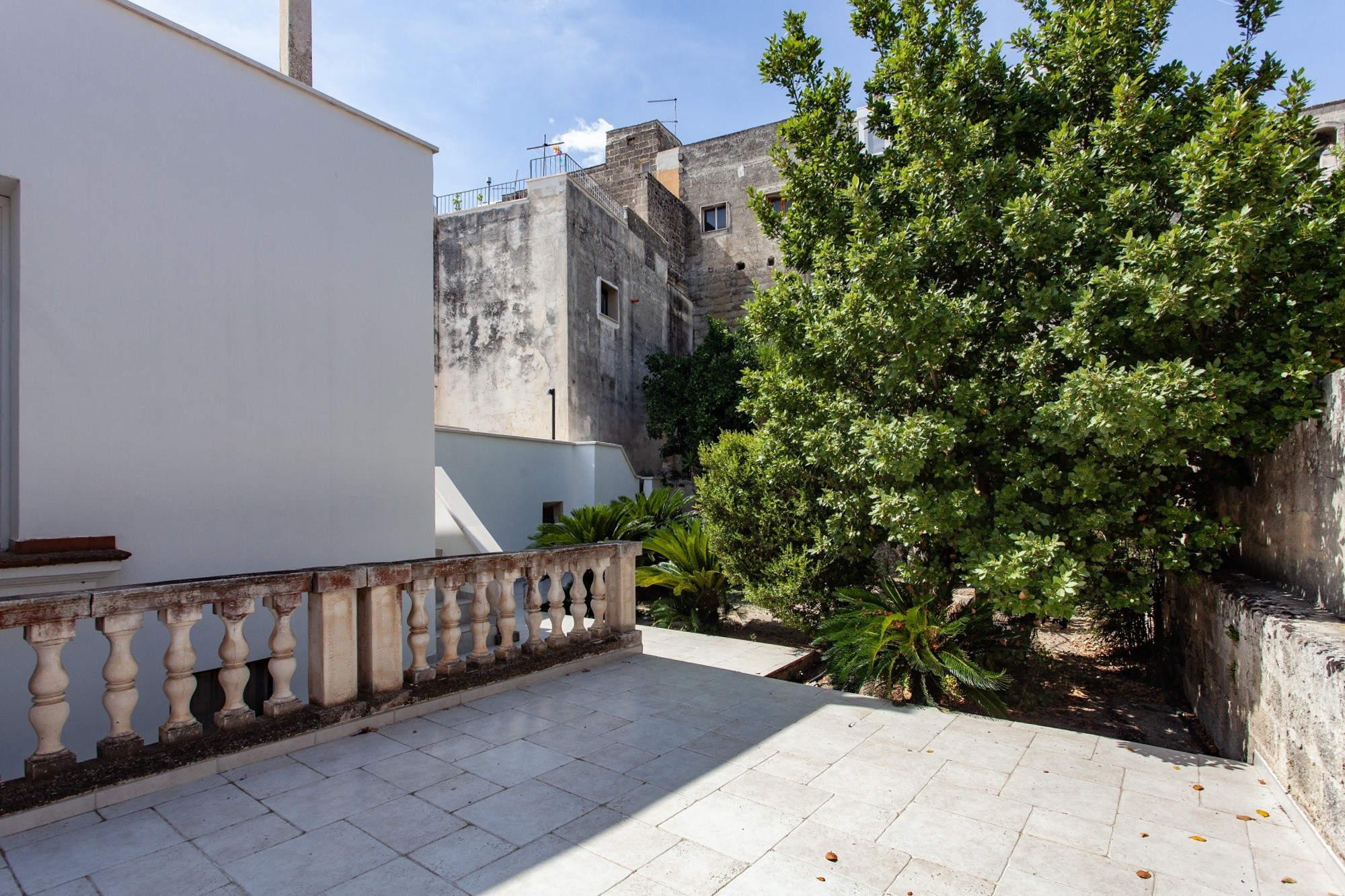 I den förtrollande historiska stadskärnan i Oria erbjuder denna prestigefyllda fastighet en sällsynt kombination av historia, charm och generösa utomhusytor. Egendomen omfattar en fristående lägenhet med trädgård och terrasser, ett gästhus samt ett rymligt garage med angränsande enhet på bottenvåningen – en unik möjlighet att uppleva den äkta medelhavslivsstilen. Huvudbostaden ligger på första våningen, omfattar 167 m² på ett plan och bevarar den lokala arkitekturens kännetecken med stjärnvalv, tunnvalv och lunettvalv – några med vackra fresker – i harmonisk kombination med modern minimalistisk inredning. Golv i färgad marmor och parkett förhöjer den eleganta atmosfären. Planlösningen inkluderar ett imponerande vardagsrum med freskmålat valv, en ljus matsal med anslutning till kök och tvättstuga, samt tre sovrum och två badrum. En täckt terrass med utsikt över stadskärnan – en perfekt plats för frukost på morgonen – och en privat balkong kompletterar våningsplanet. En trappa leder till den privata utomhusytan på ca 265 m², som kombinerar medelhavsträdgård (palmer, citrus, stor fikon) med panoramaterrasser som erbjuder vidsträckta vyer över Oria-slottet, den färgstarka katedralkupolen och stadens takåsar. En del av klostergången från det forna Celestinerklostret tillför ytterligare historiskt värde.På samma nivå finns gästhuset på 24 m², med sovrum, badrum och pentry – idealiskt för gäster eller för turistuthyrning.På ca 200 meters avstånd finns även ett 42 m² stort garage med elektrisk port och ett litet badrum. Intill ligger ytterligare en enhet om ca 80 m² (kommersiell yta) i behov av renovering, med god utvecklingspotential.Fastigheten är i gott skick, inflyttningsklar och utrustad med gasuppvärmning och luftkonditionering. Försäljningen gäller enbart hela komplexet som beskrivs ovan; separata försäljningar accepteras inte.Om OriaOria är en pittoresk medeltida stad, känd för sitt slott, sina smala gränder, den färgstarka katedralkupolen och sitt rika kulturarv. Läget är strategiskt: endast 35 km från Brindisi internationella flygplats, cirka 25 minuter från Joniska havets sandstränder och nära viktiga destinationer som Lecce, Ostuni, Alberobello och Itria-dalen.Ett extra plus för internationella köpare är Italiens förmånliga särskilda skatteregim på 7 %, som gäller för utländska pensionärer som flyttar sin bostad till Oria.