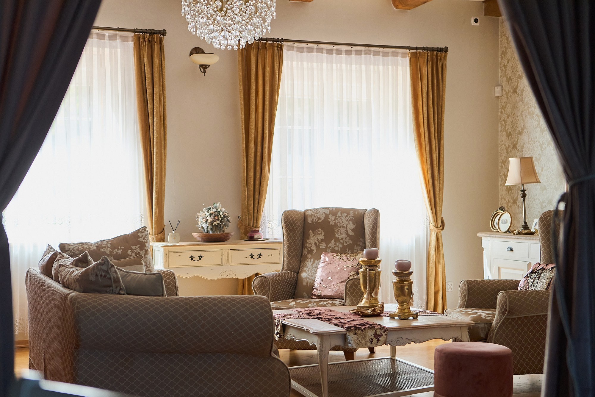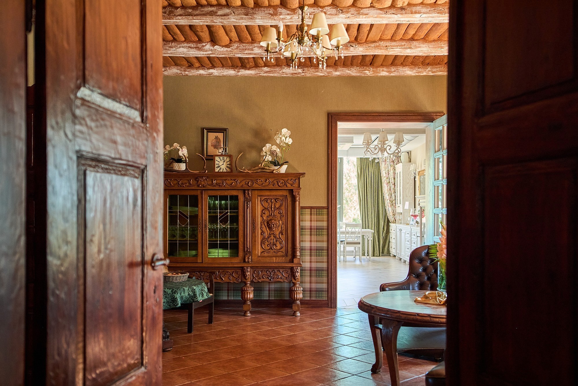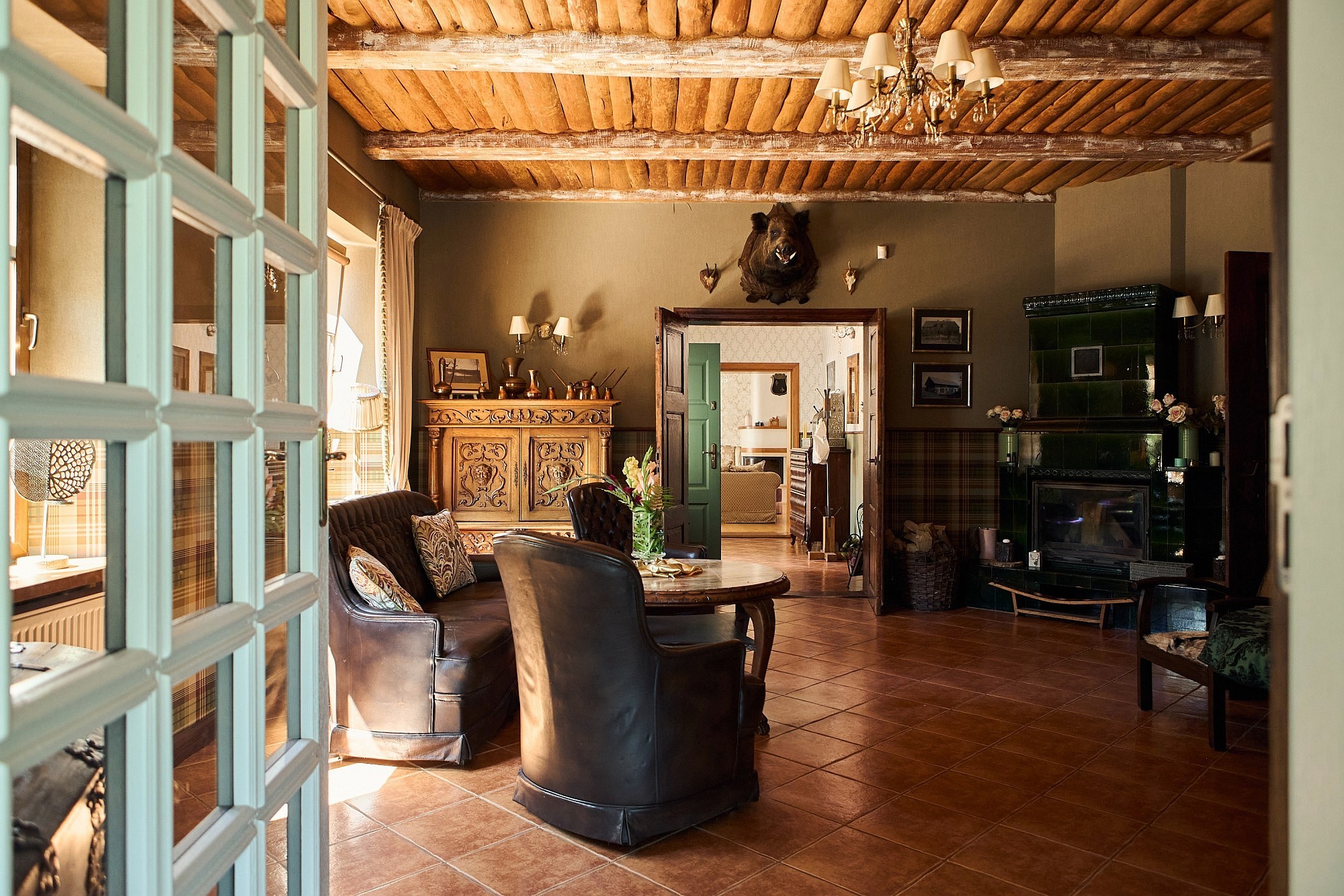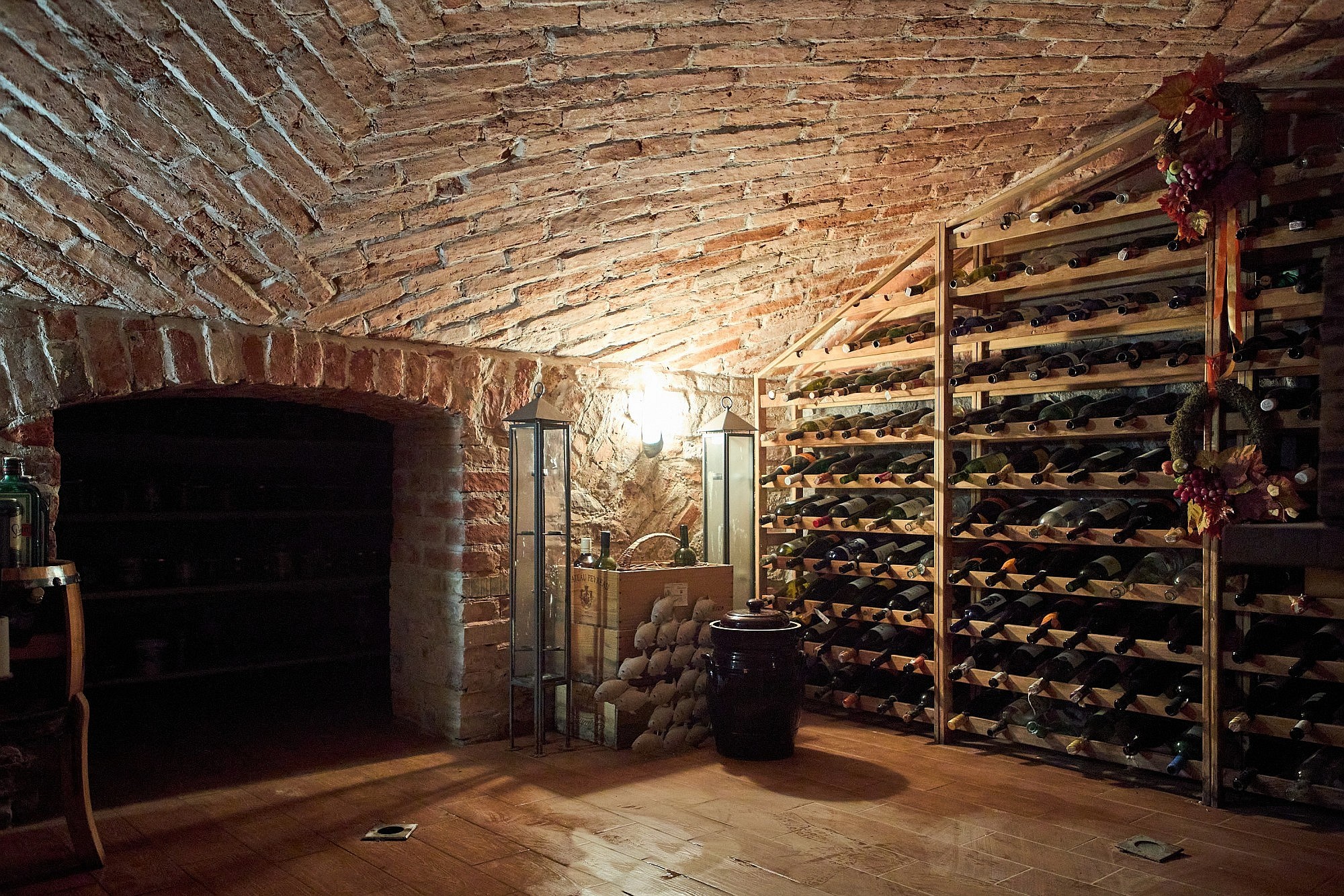 Bottenvåningen är utformad för både representation och privat bruk och rymmer ett vardagsrum samt ett separat jaktroom, båda utrustade med öppen spis. Köksfaciliteterna är uppdelade i en privat del och ett professionellt restaurangkök som fortfarande har kvar en original koleldad spis. En luftkonditionerad sal ger plats för evenemang med upp till 50 personer, medan de övre våningarna erbjuder ett gemensamt sällskapsutrymme på knappt 50 m². I källaren finns ett svalt förråd för förvaring av matvaror och vin.