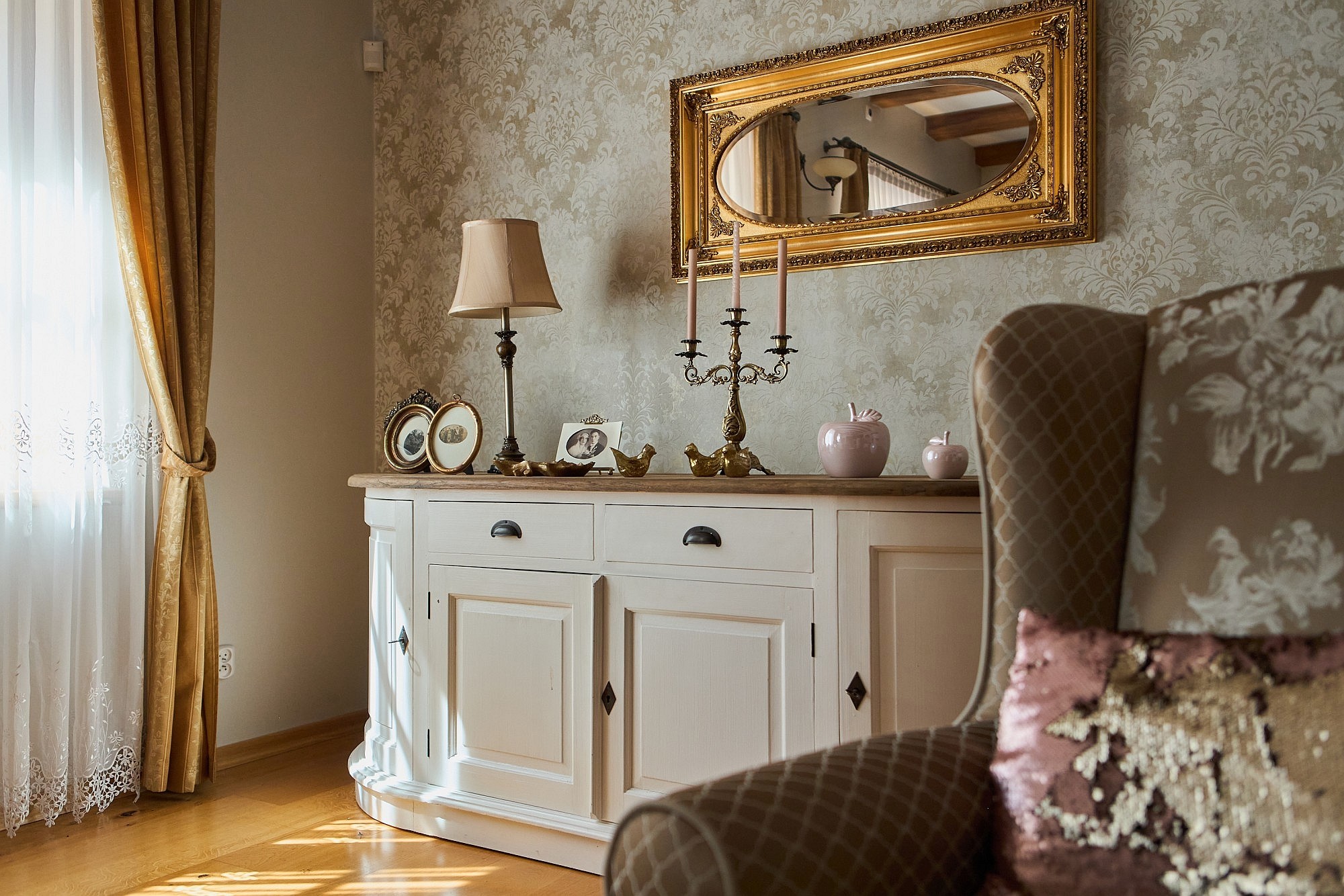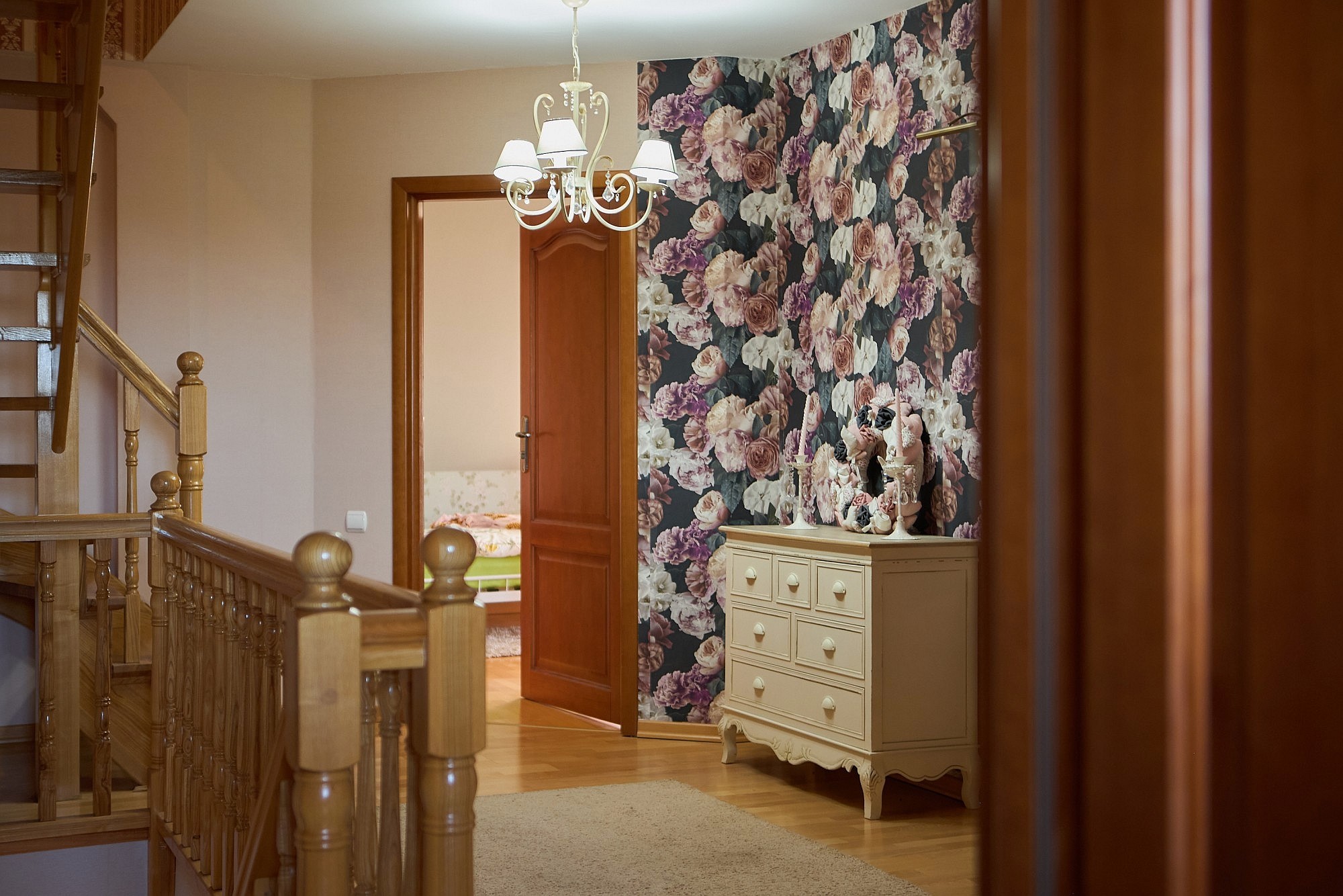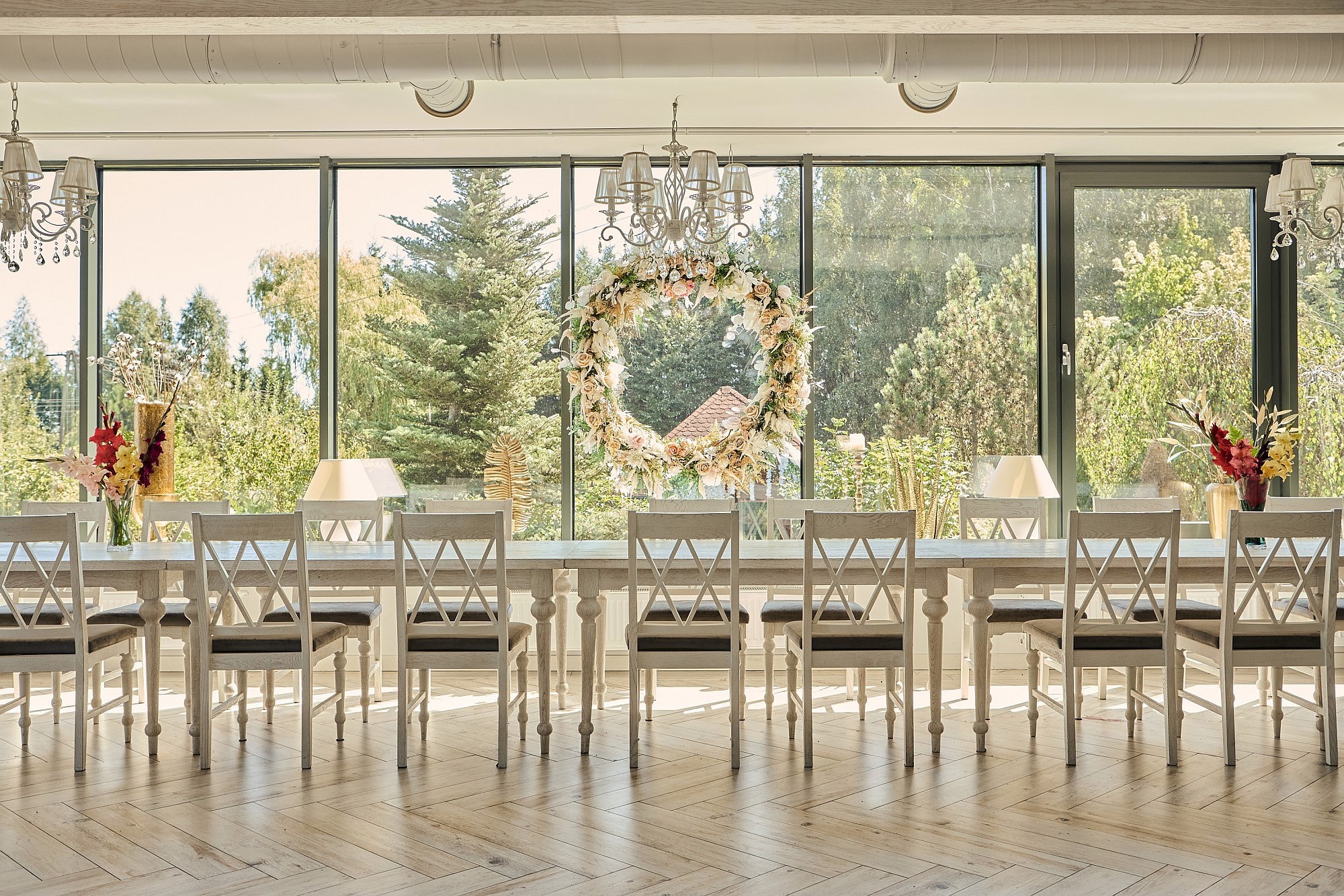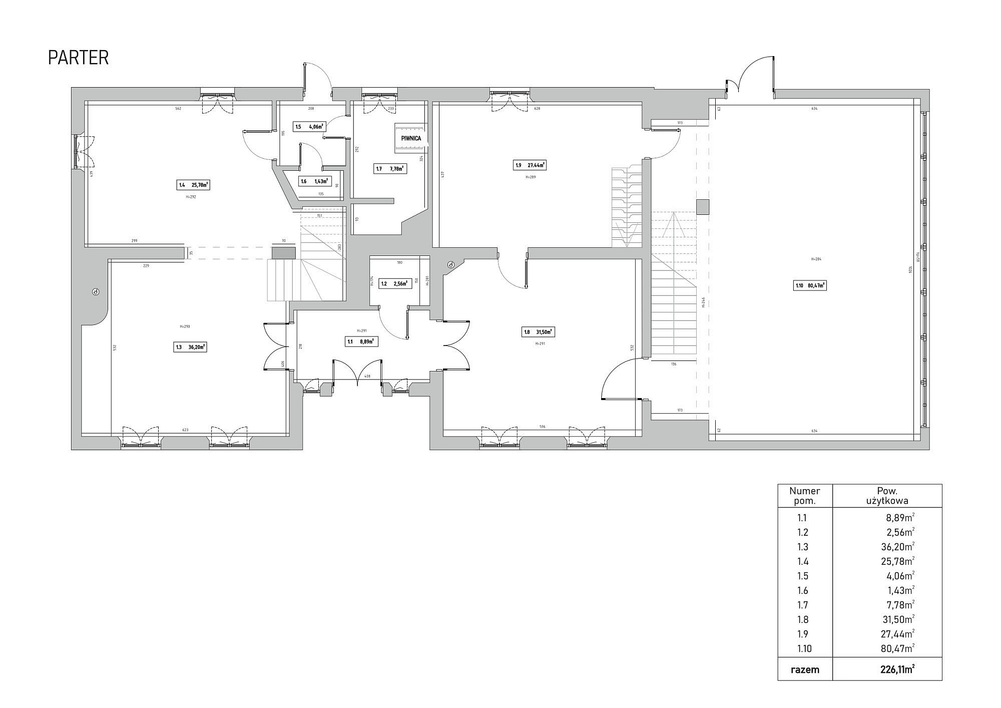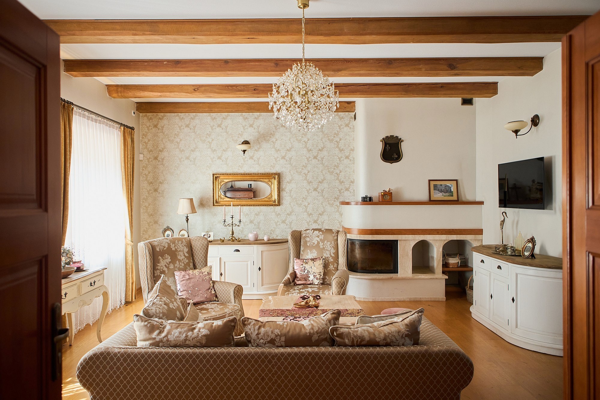 Bottenvåningen är utformad för både representation och privat bruk och rymmer ett vardagsrum samt ett separat jaktroom, båda utrustade med öppen spis. Köksfaciliteterna är uppdelade i en privat del och ett professionellt restaurangkök som fortfarande har kvar en original koleldad spis. En luftkonditionerad sal ger plats för evenemang med upp till 50 personer, medan de övre våningarna erbjuder ett gemensamt sällskapsutrymme på knappt 50 m². I källaren finns ett svalt förråd för förvaring av matvaror och vin.