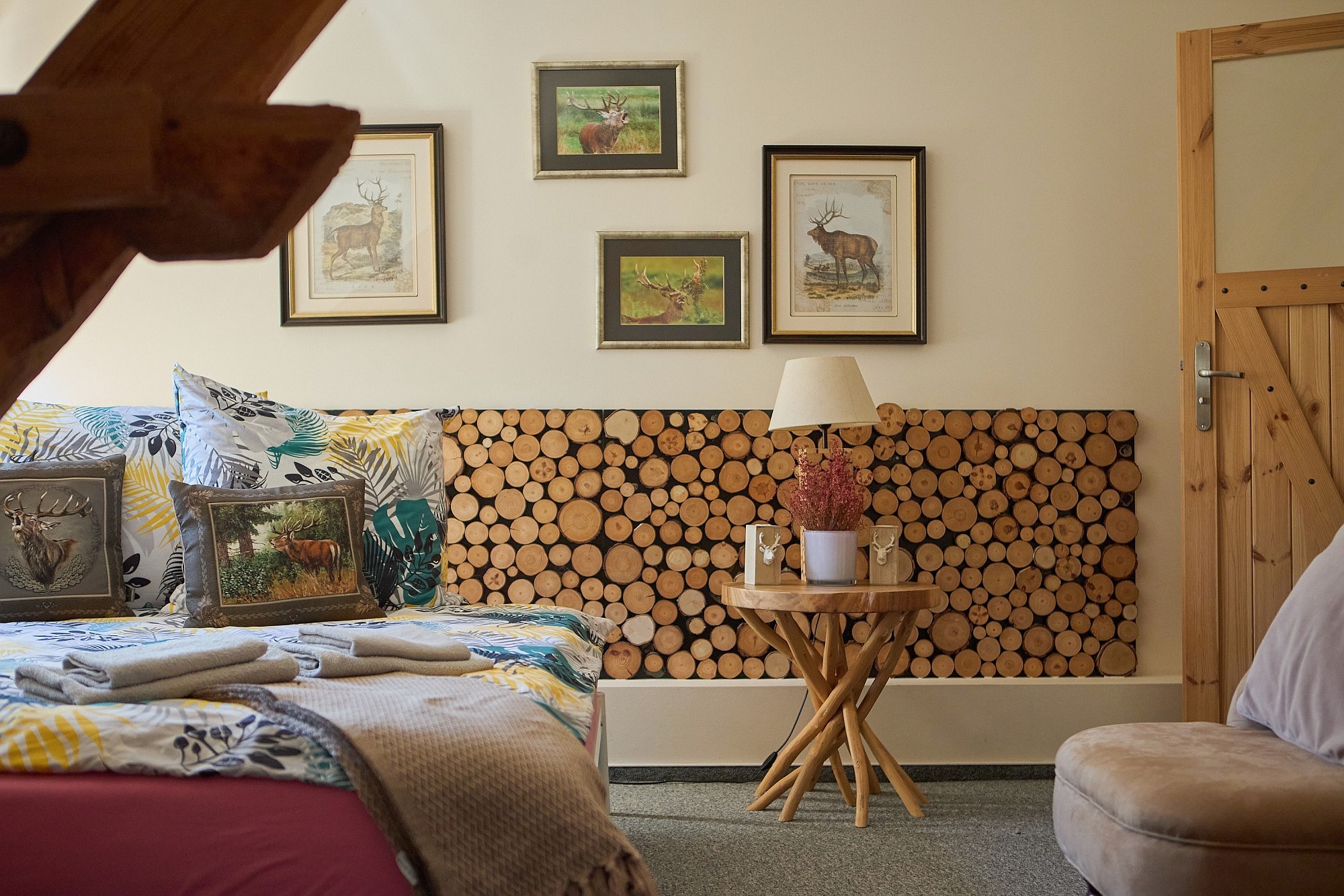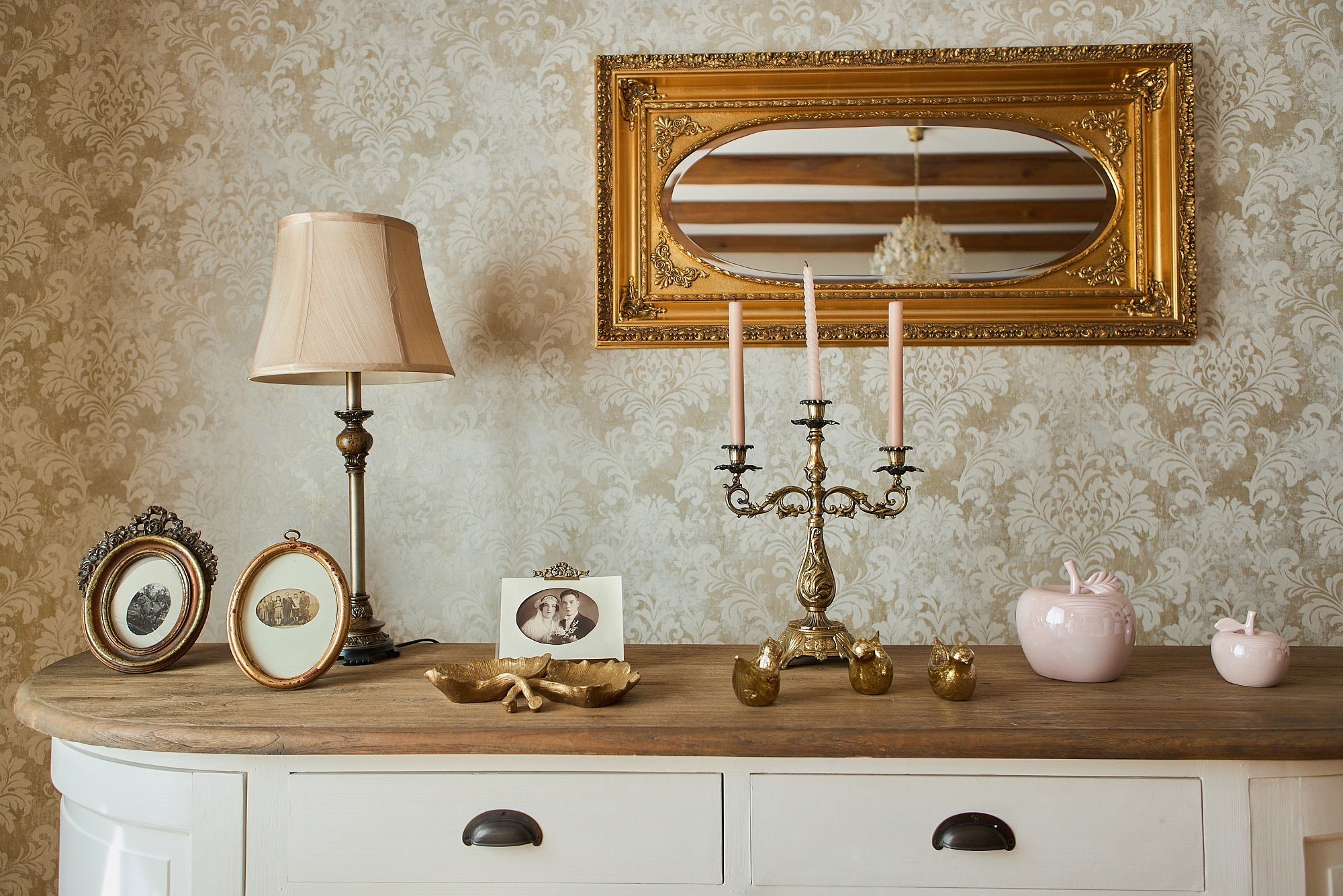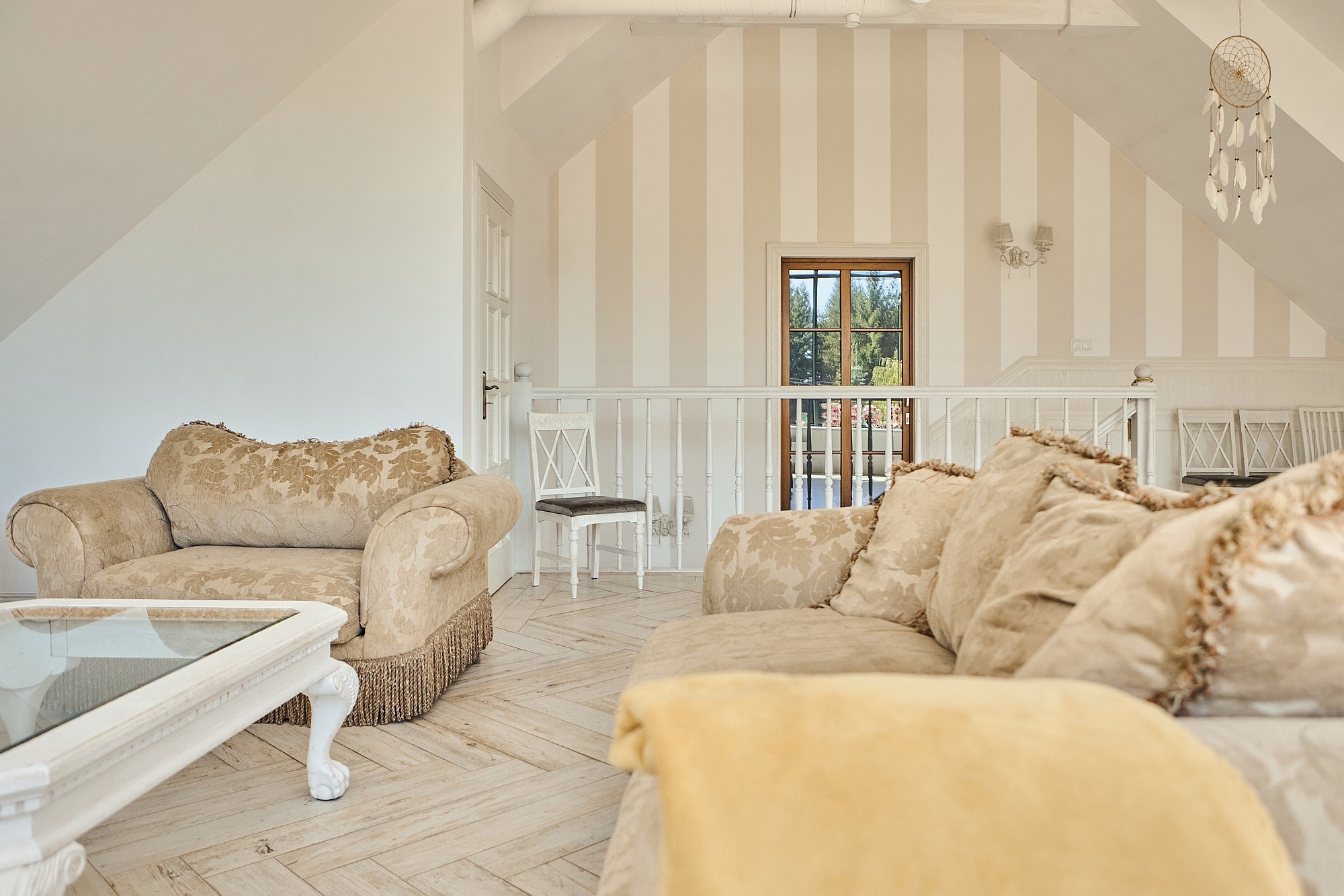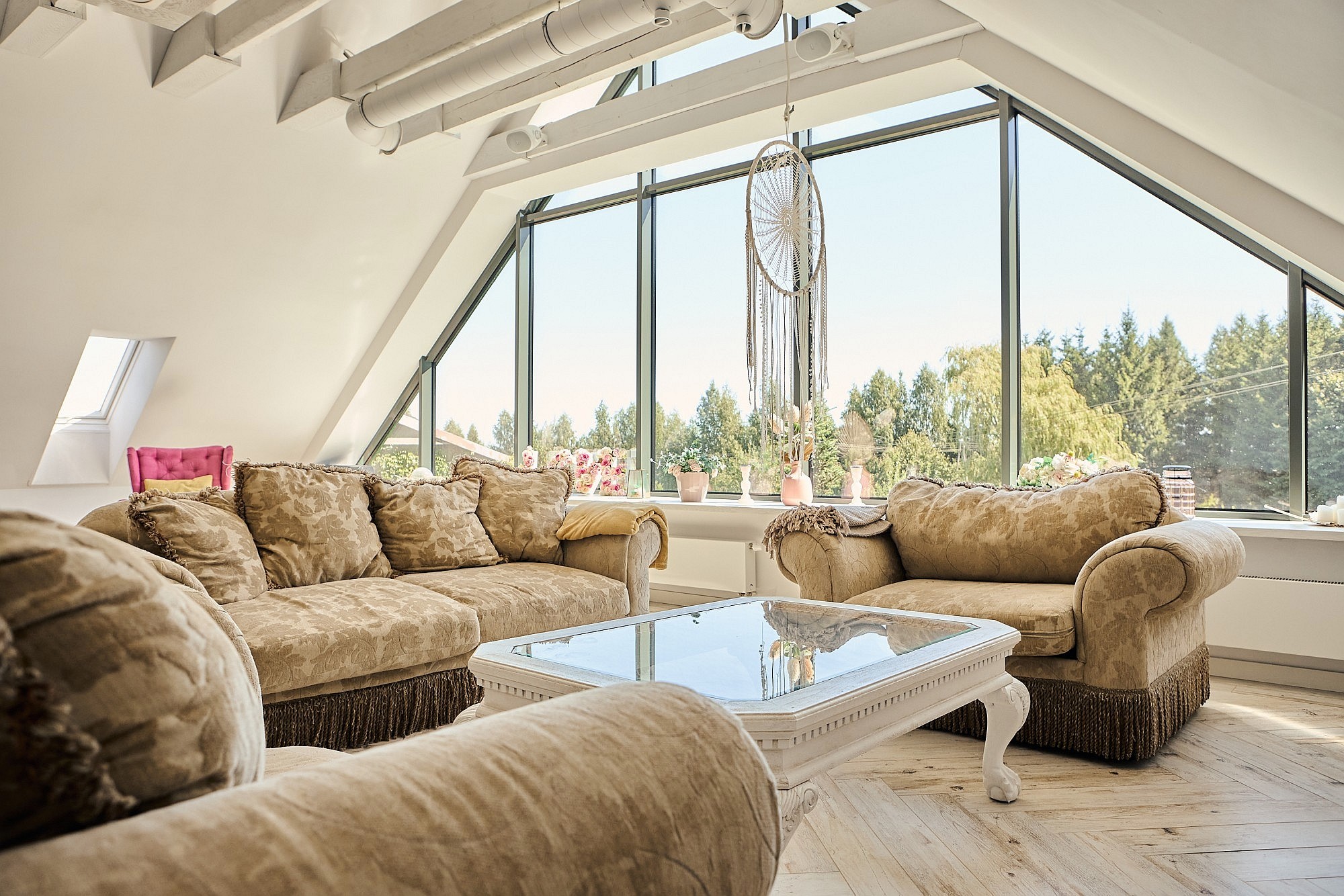 Bottenvåningen är utformad för både representation och privat bruk och rymmer ett vardagsrum samt ett separat jaktroom, båda utrustade med öppen spis. Köksfaciliteterna är uppdelade i en privat del och ett professionellt restaurangkök som fortfarande har kvar en original koleldad spis. En luftkonditionerad sal ger plats för evenemang med upp till 50 personer, medan de övre våningarna erbjuder ett gemensamt sällskapsutrymme på knappt 50 m². I källaren finns ett svalt förråd för förvaring av matvaror och vin.