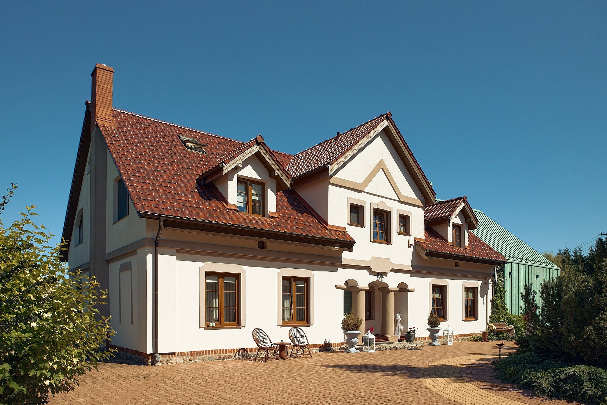 Landshuset är uppfört i tegel med en traditionell takstol i trä och tegelpannor. Den tekniska infrastrukturen är modern och omfattar en centralanläggning med eko-kolpanna, understödd av solfångare för varmvattenberedning. Dessutom finns luftkonditionering och ventilation i tillbyggnaden. Fastigheten är ansluten till det kommunala vatten- och elnätet och skyddas av ett larmsystem med 24-timmars videoövervakning samt väktarservice.