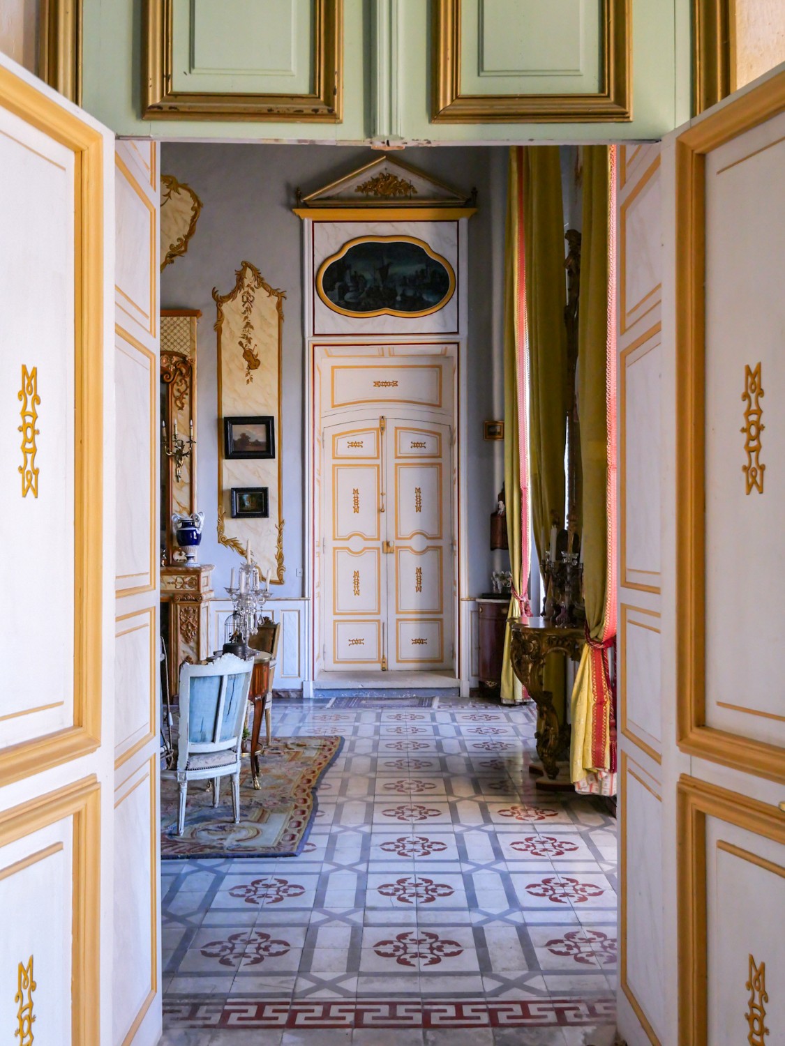Hallen, med en takhöjd på 5,3 meter och rikligt dagsljus, öppnar upp mot Grand Salon på 80 m². Joniska pilastrar och monumentala pelare leder upp till den majestätiska huvudtrappan som går direkt upp till övervåningen, där balkonger skapar en dramatisk utsikt över hallen. Trappan anses vara en av de vackraste privata trapporna från 1700-talet i Frankrike.