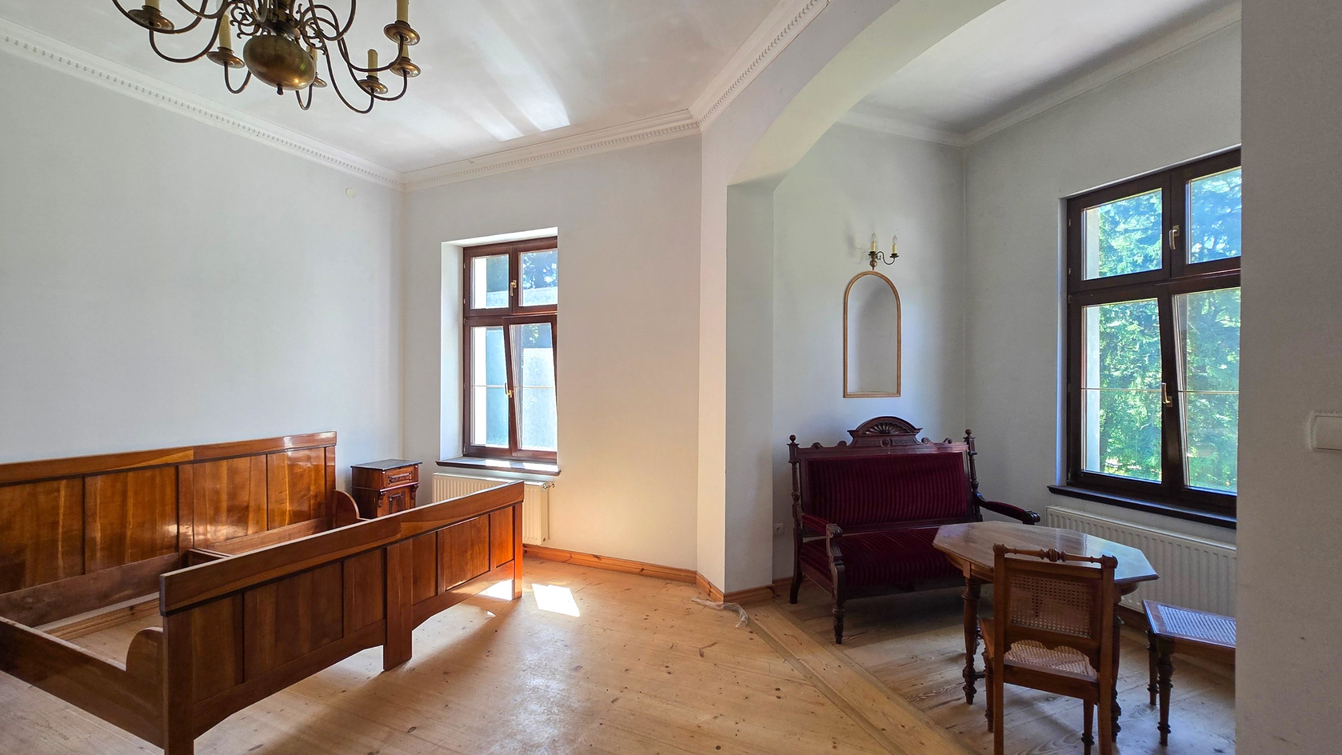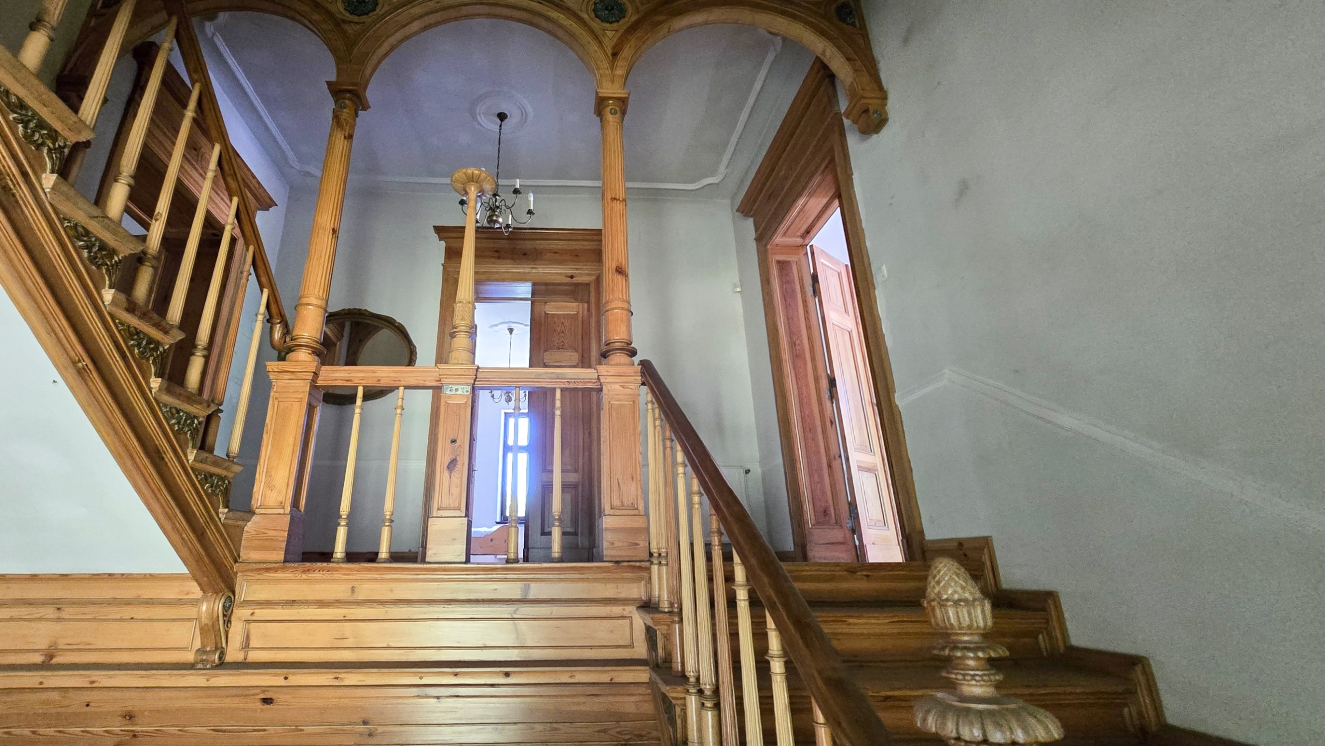 Invändigt imponerar rekonstruerade stuckaturer, snidade balustrader och original trägolv.